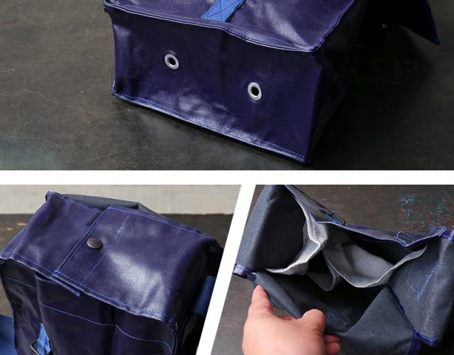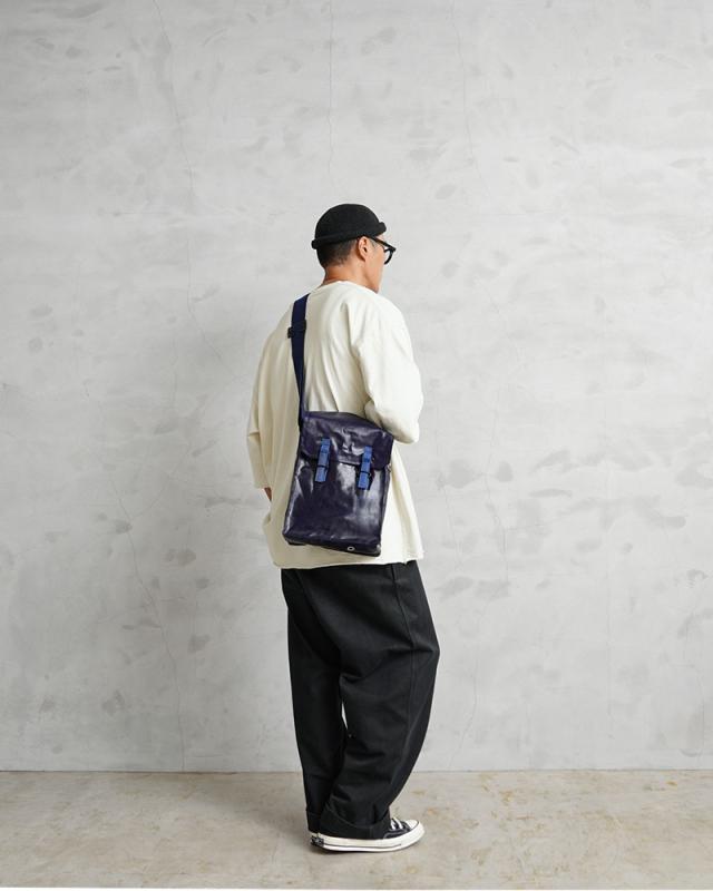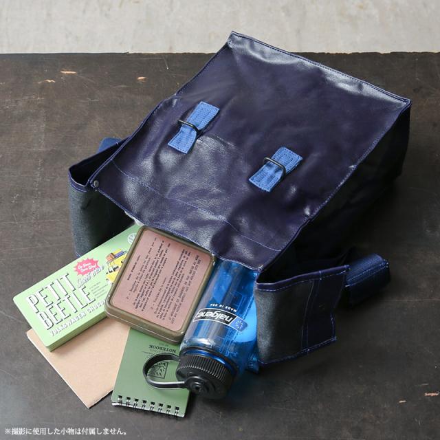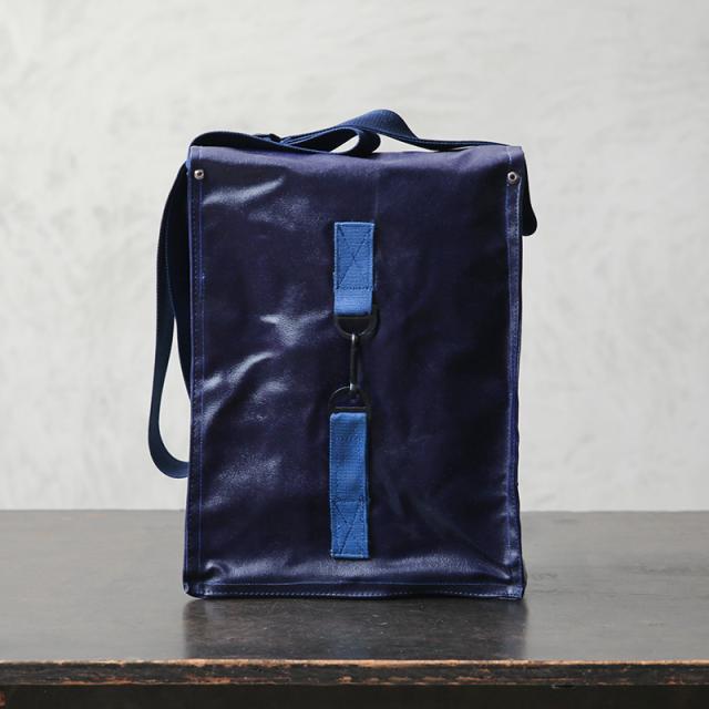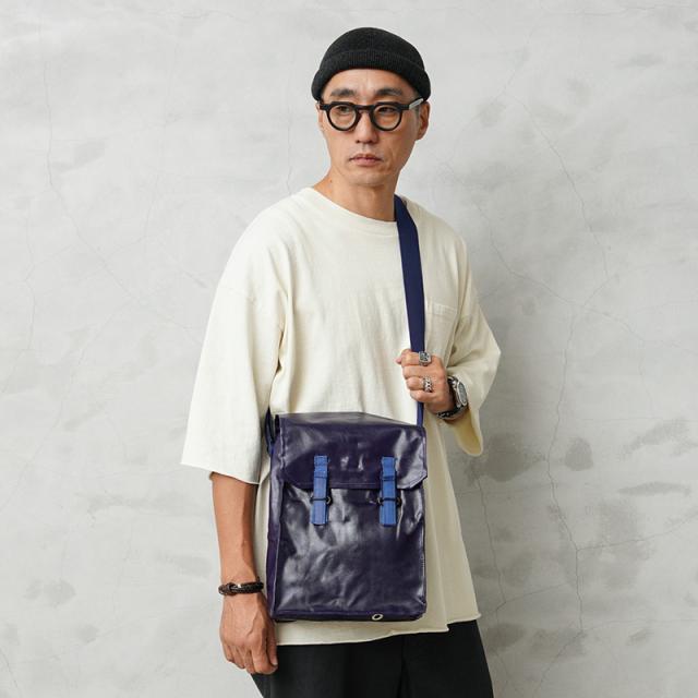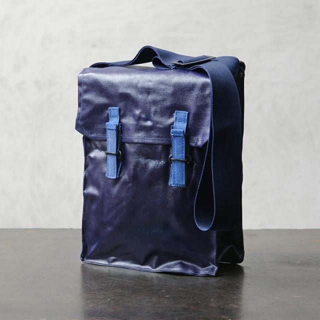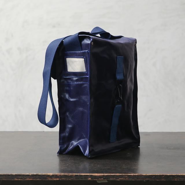 おそらく1970年代に製造された、ガスマスク用のショルダーバッグが入荷しました。適度な艶感のあるPVCレザーを使用し、スクエアなシルエットとなんといっても鮮やかなネイビーが特徴的。 インナーはコットン生地の仕切りがあり、ガスマスクのフィルターなどを収納できるように4つのエリアに分かれています。コットンキャンバスのショルダーストラップ付きで、背面部分にはベルトなどに固定できる金具、底部には排水穴も備えています。