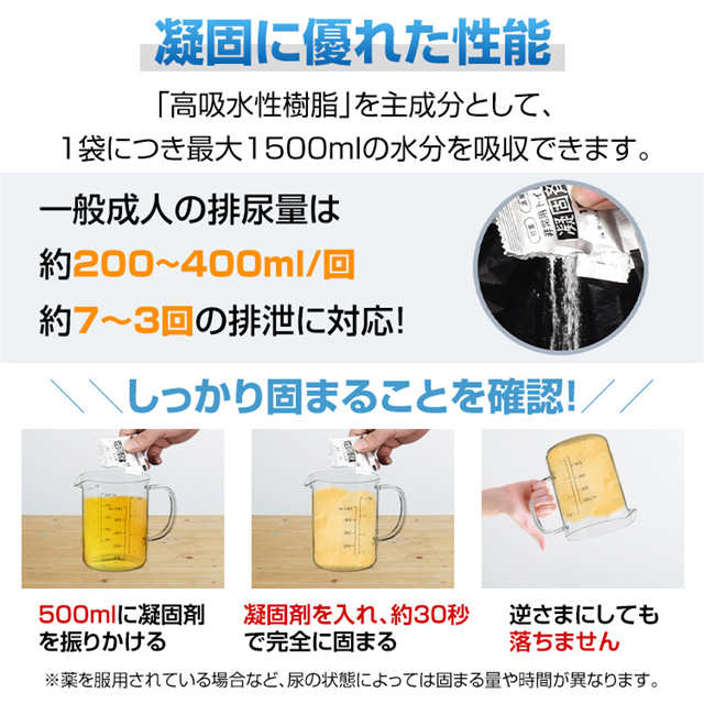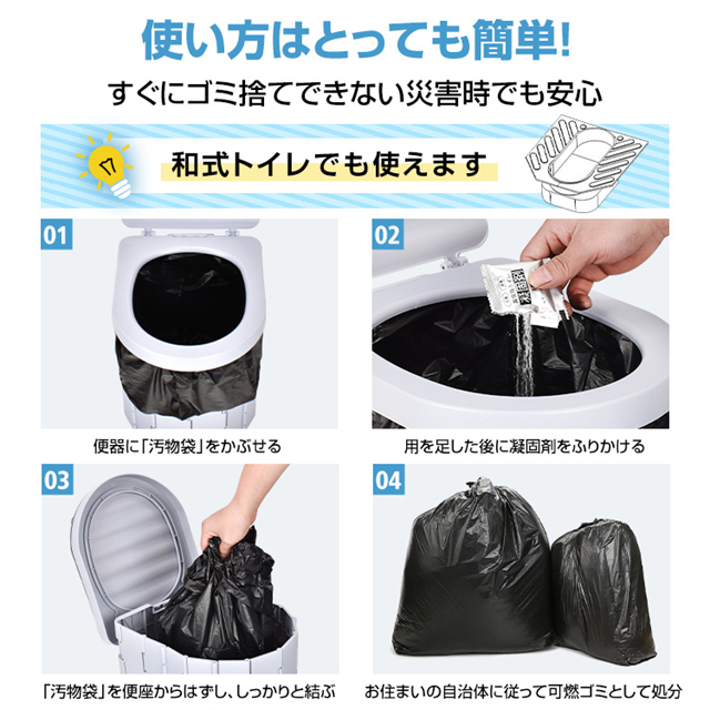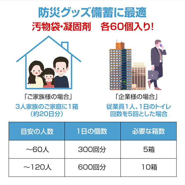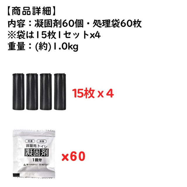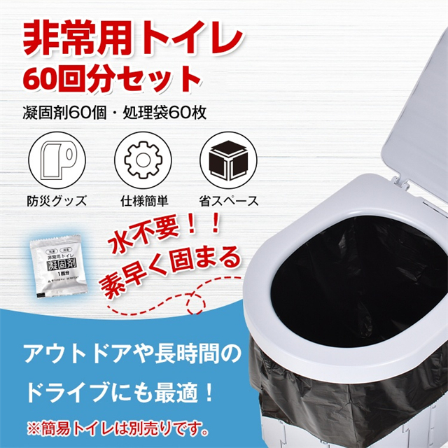 - 防災に備えて購入しました。袋と凝固剤がセットなのでたすかります。
