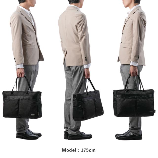 | 肩掛可能な使い勝手よいサイズ感の横長シルエットトートバッグ。手提げ、肩掛けの2WAY仕様でオンオフどちらにも扱いやすいデザイン。天面はファスナーで開閉するため、雨天時での使用でも中に水が入りにくくなっている。内装はシンプルなオープンポケット2室。前胴には財布やスマホを収納できるサイズのファスナーポケット2室、後胴には靴が入る大きなサブポケットが一室配置。天面はファスナーで開閉。雨天時でも中に水が入りにくい仕様。内装は大容量でシンプルに。小物を小分けできるオープンポケット2室。前胴には財布やスマホを収納できるサイズのファスナーポケット2室。後胴にはサブポケットを一室配置。サブポケットは内側に膨らみ、シューズなど嵩張るものを入れても見た目に影響しません。サイドには水や空気が通るメッシュポケットを配置。ペットボトルや傘などを気にせず入れられます。ファスナー素材には滑りの良いビスロンファスナーを採用。 |