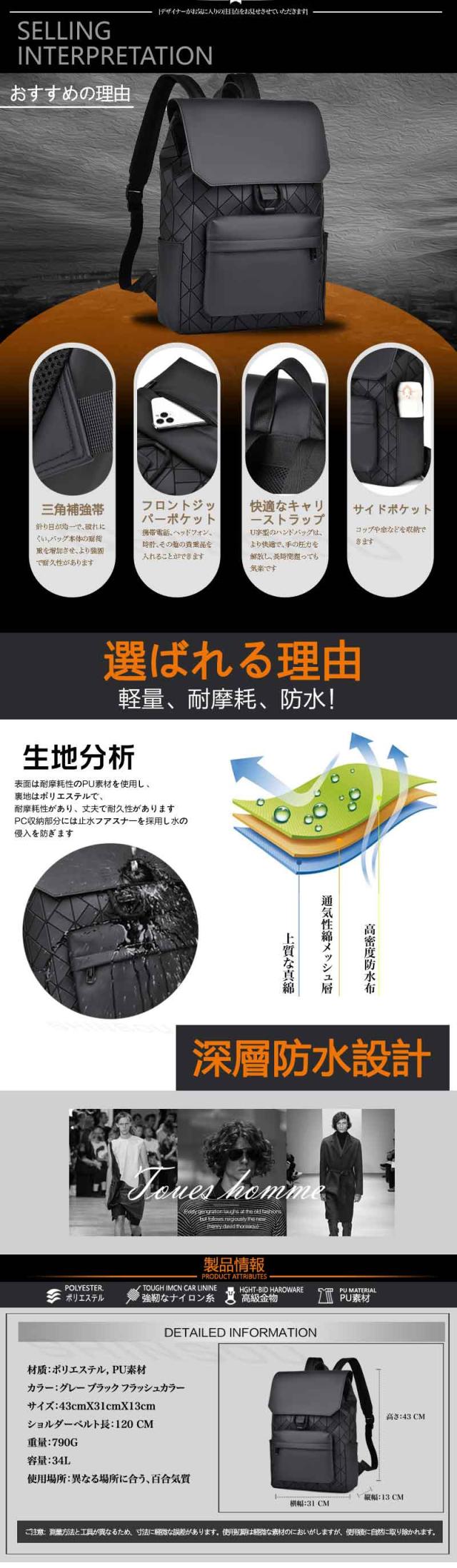 サイズ:42×32×13cm、重さは?790g、容量:34L 材質:表面は耐摩耗性のPU素材を使用し、裏地はポリエステルで、耐摩耗性があり、丈夫で耐久性があります。 |