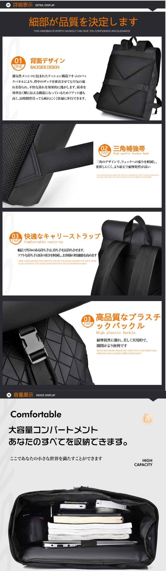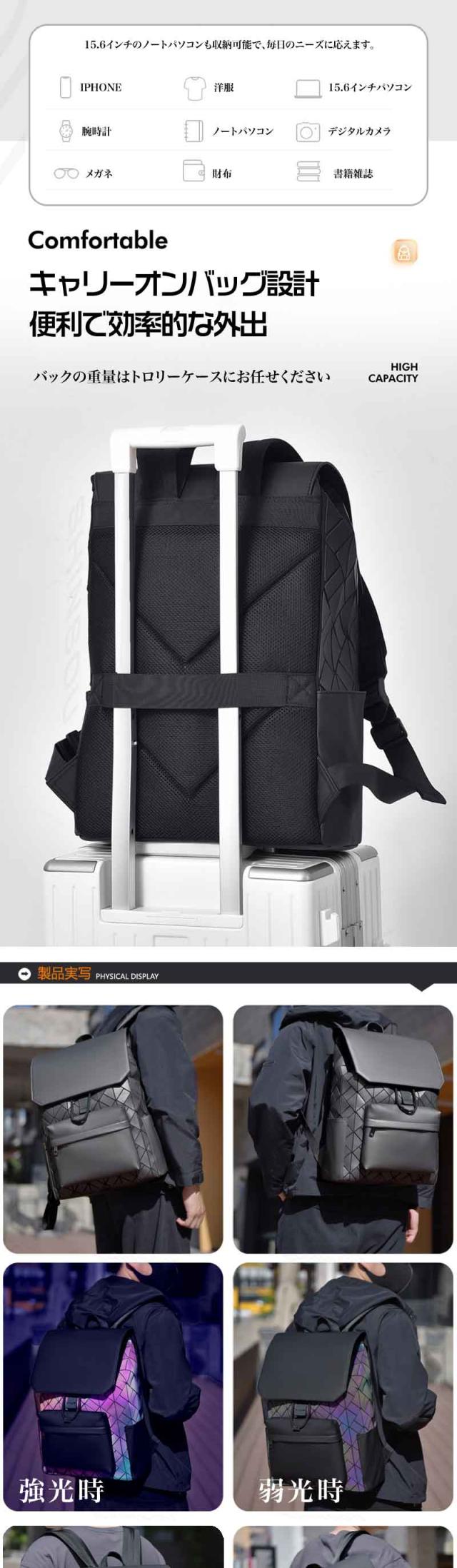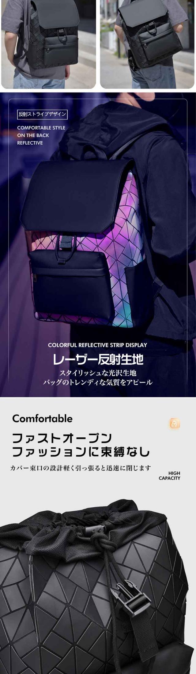 ドローストリング開閉式で、軽く引っ張るとすぐに閉まり、素早く移動できるため、おしゃれで自由度が高いです。スーツケースのキャリーハンドル用の固定ストラップがあるため、スーツケースに取り付けることができます。両手が空くので、旅行時に持ち運びやすいのが特徴です。反射性のあるカラフルなデザインを採用しており、光の強さに応じて色が変わります。夜間の移動がより安全になります。 【快適な背負い心地】背面は背骨のS字に合わせたデザインを採用しており、肩や背中への負担を軽減することができます。リュックの背面とショルダー部分には、通気性の良いメッシュ素材を使用しています。長時間背負っても蒸れにくく、疲れにくいため、快適に歩くことができます。 |