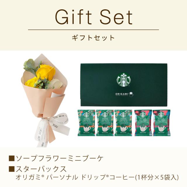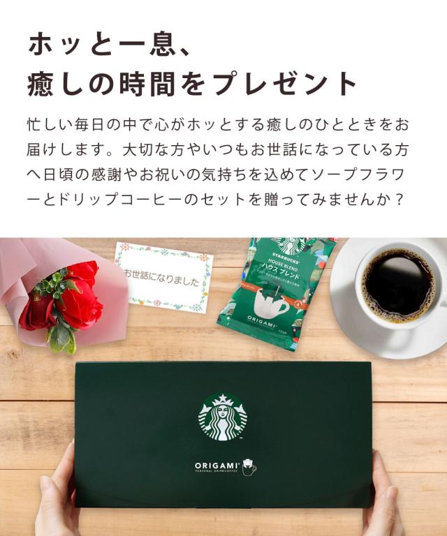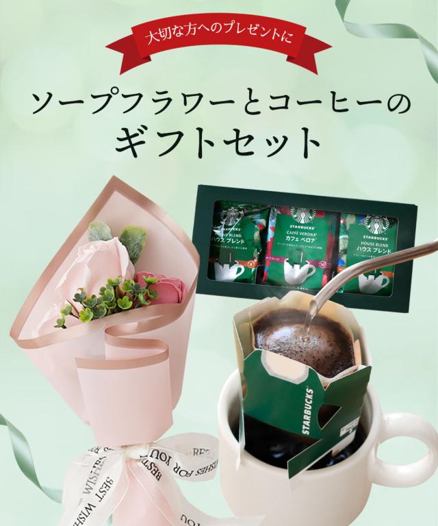 香りと彩りに癒されるソープフラワーと、人気カフェ「スターバックスコーヒー」のドリップコーヒーのギフトセットです。