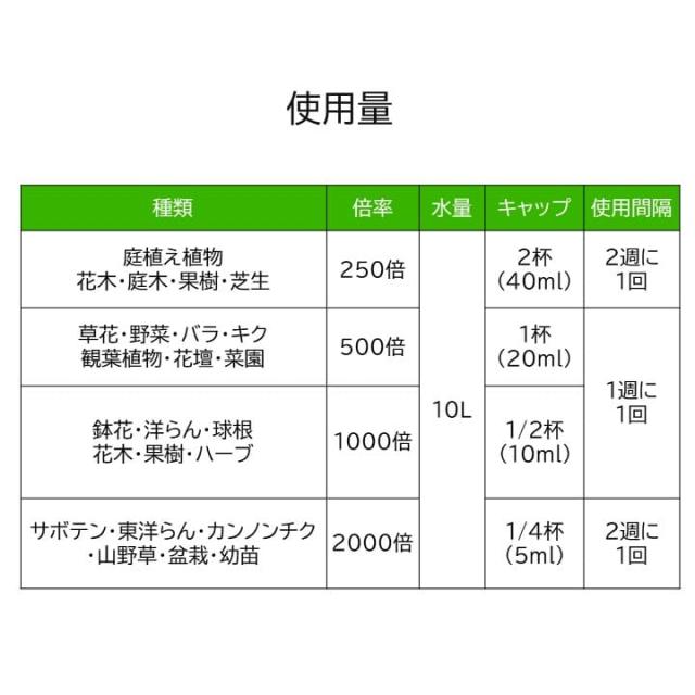 下記の割合を水でうすめて、株元へ与えてください。