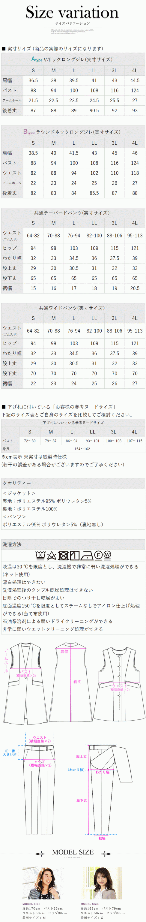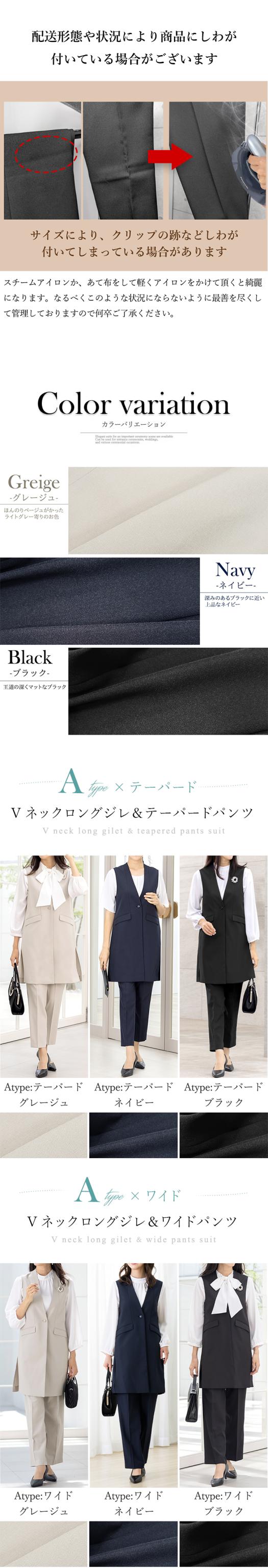 パンツはセンターにタックが入っており、ヒップとお腹周りをすっきり見せてくれるテーパードパンツタイプと、太もも周りをきれいにカバーするワイドパンツもお選びいただけます。