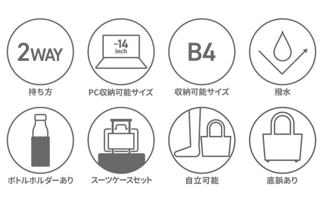| 仕様 | <外側> ジップポケット(L)×1 └ 内蔵 ポケット(S)×2 ペンホルダー×2 ジップポケット(L)×1 ジップポケット(S)×1 <内側> PC収納×1 ジップポケット(L)×1 ポケット(S)×3 ボトルホルダー×1 <付属品> ショルダーストラップ×1 |