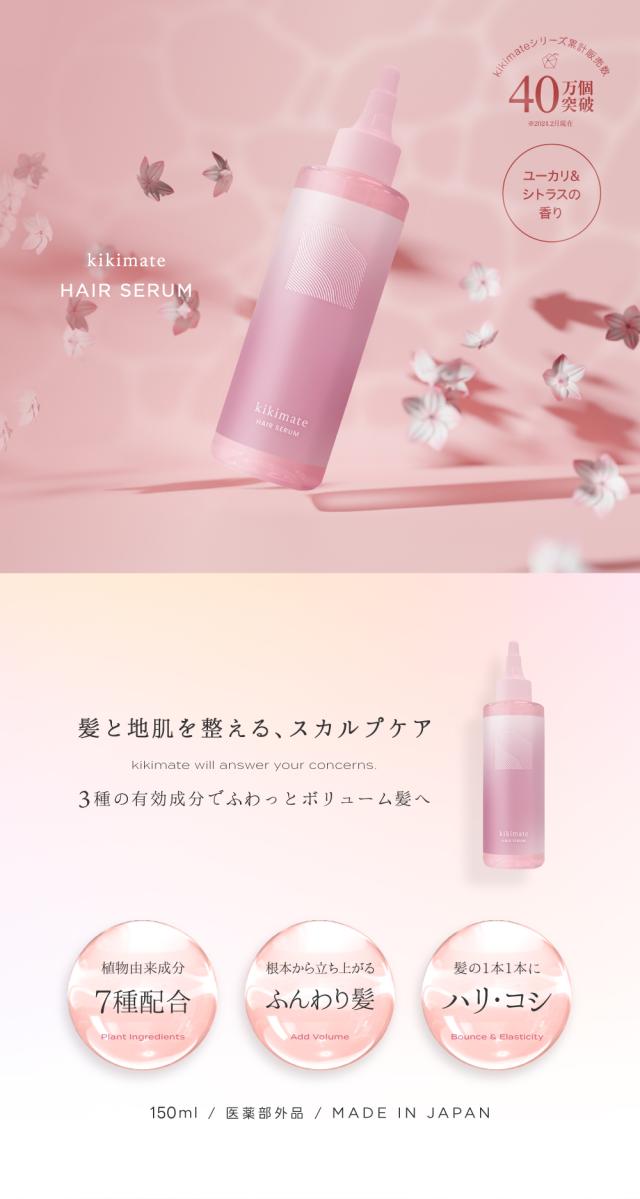 kikimate(キキメイト)ヘアセラムはデリケートな女性の頭皮に着目した女性用育毛剤です。トリプル有効成分が根元からふわっと立ち上がるボリューム髪へ導き、さらに7種の植物由来成分が頭皮をしっかりと保湿。潤いに満ちた地肌へ。