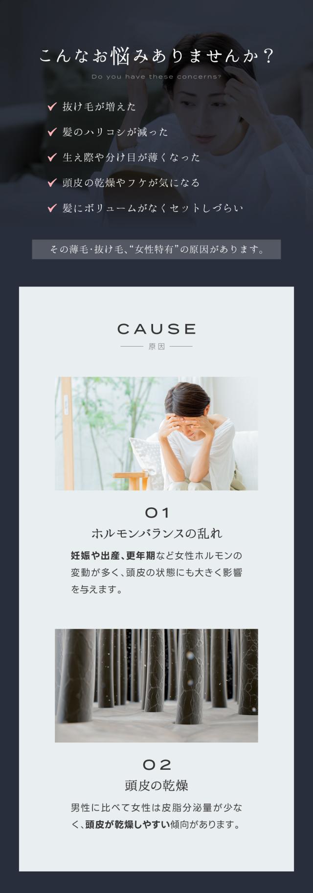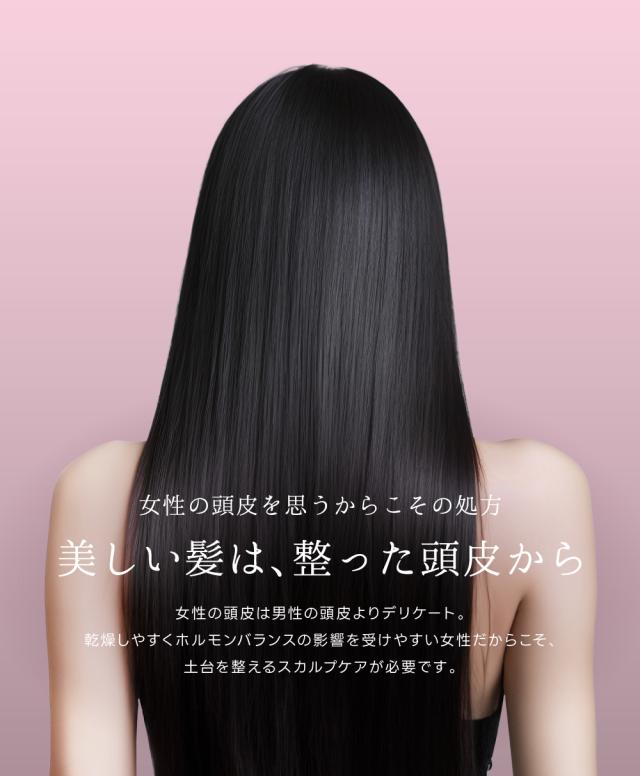 女性の頭皮は乾燥しやすく、妊娠や出産、更年期などのホルモンバランスの乱れに影響を受けやすい傾向があります。女性の頭皮を想った処方で、細くダメージを受けやすい髪を、美しくハリとコシのある髪へと導きます。