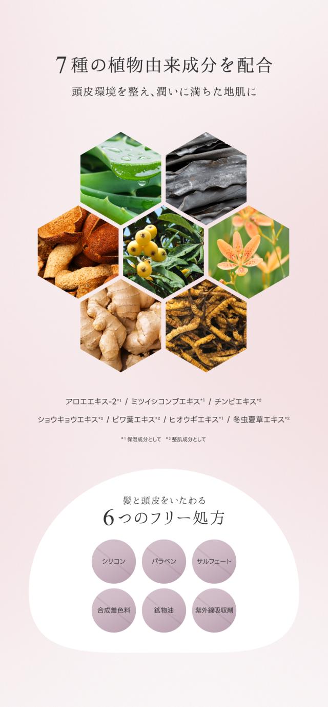 【6つのフリー処方】シリコン、パラベン、サルフェート、合成着色料、鉱物油、紫外線吸収剤を無添加。ダメージを抑え、敏感な女性の頭皮をいたわる処方です。