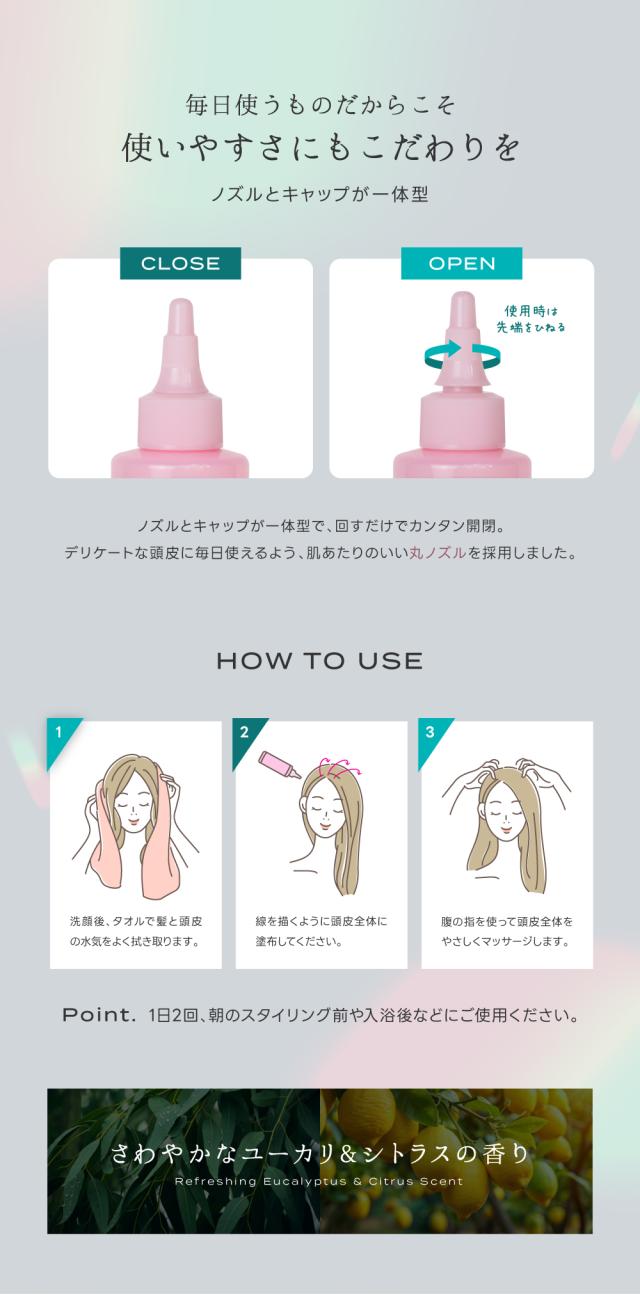 ノズルとキャップが一体型で、ノズルを回すだけでカンタン開閉。毎日使っていただくものだからこそ、肌あたりのいい先の丸いノズルを採用しました。また、育毛剤と分かりにくい、シンプルで上品なパッケージです。