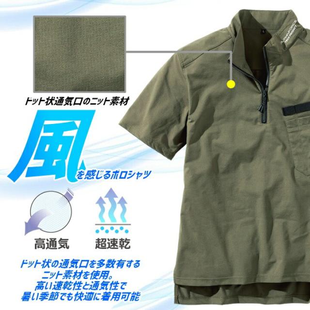 高通気で快適着用可能のハーフジップ半袖ポロシャツ