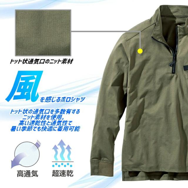 高通気で快適着用可能のハーフジップ長袖ポロシャツ