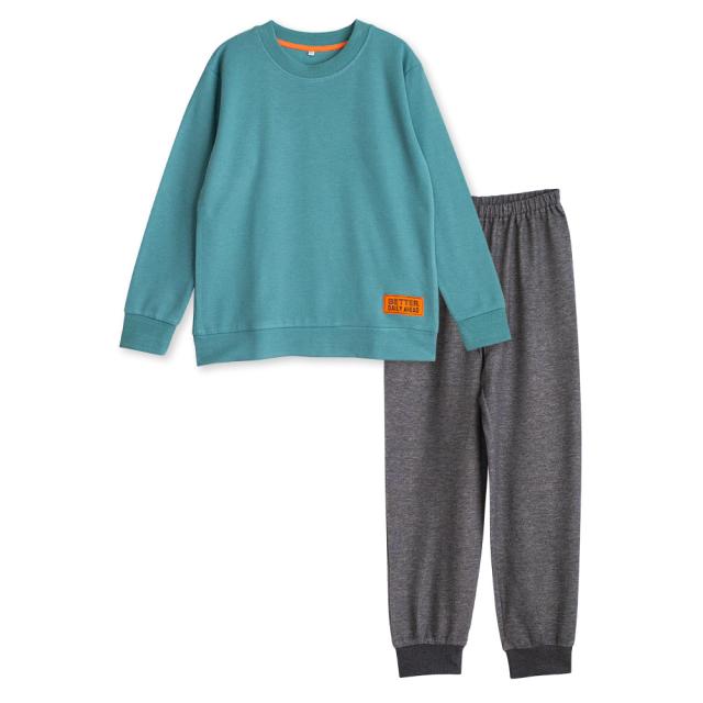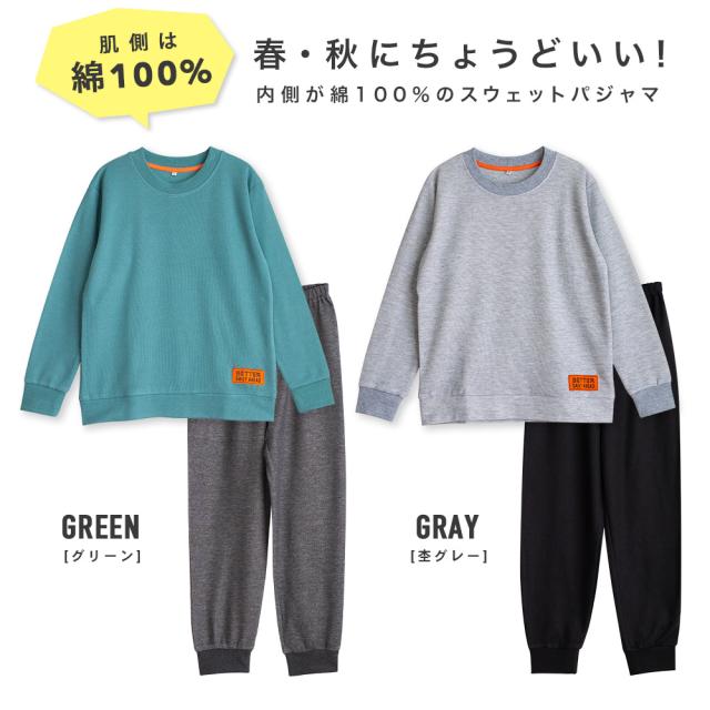パジャマ キッズ 男の子 内側が綿100% 長袖 春 秋向き スウェット上下 リブ仕様 ワッペン グリーン 杢グレー 130 140 150 160 子供 ボーイズ ジュニア