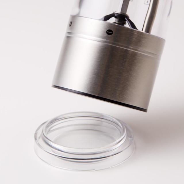 残量が一目でわかるよう、キャビンは透明になっています。また、広めの充填口により、塩や胡椒を容易に入れることができます。