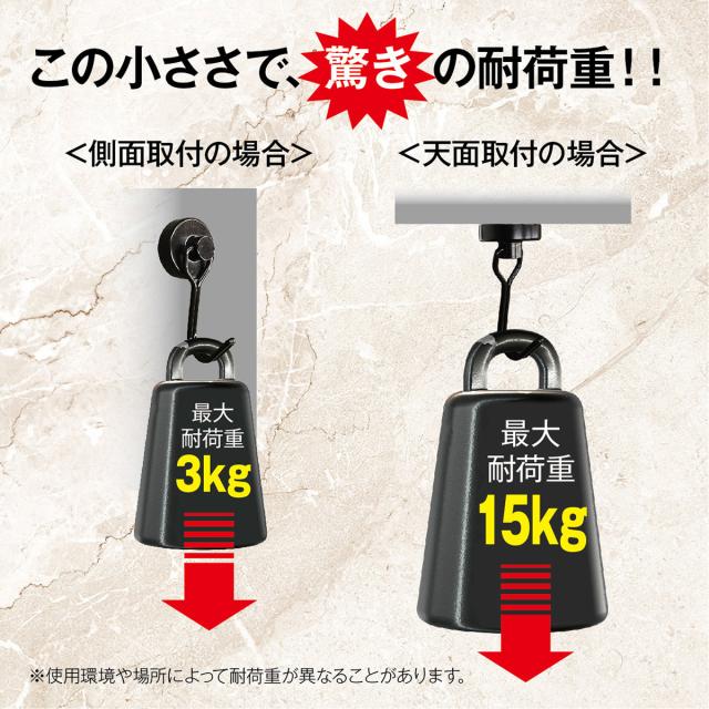 側面、天井両方に取り付け可能で、側面は耐荷重3kg、天井は耐荷重15kgまで可能です。