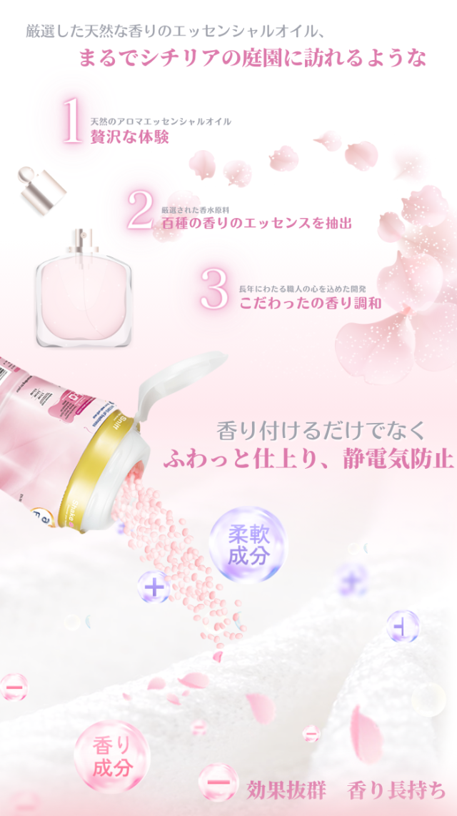 イヤな臭いは消臭効果でリセットし、ミクロカプセルに閉じ込めた上質なアロマが衣類を上品な香りで包み込みます。