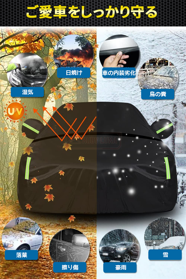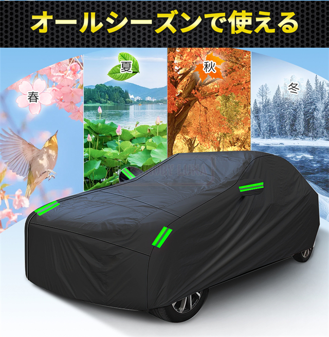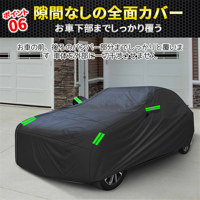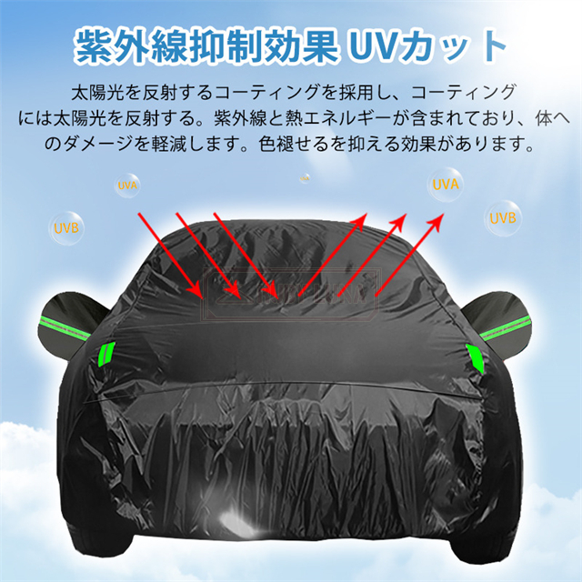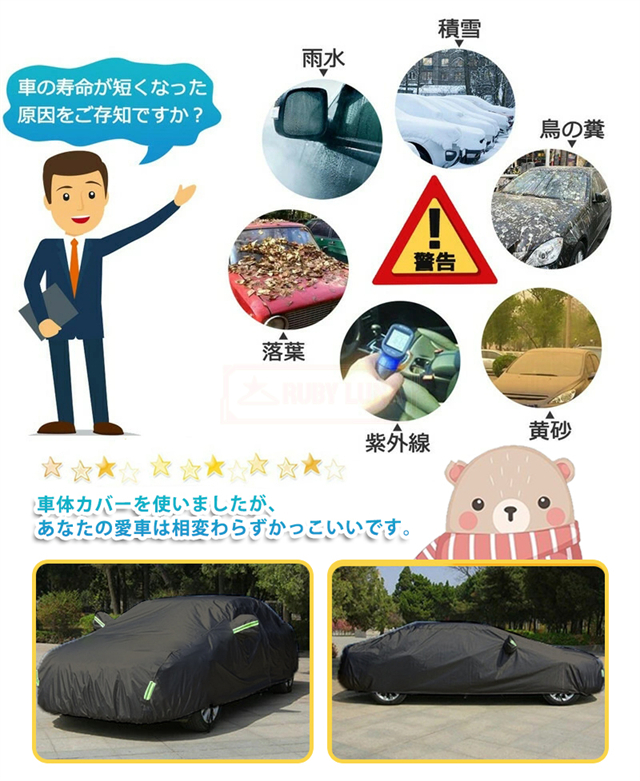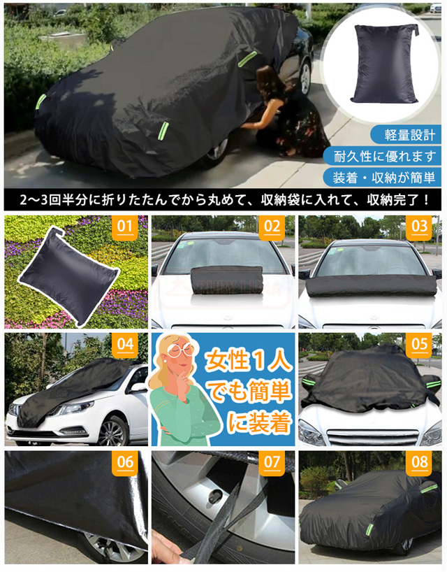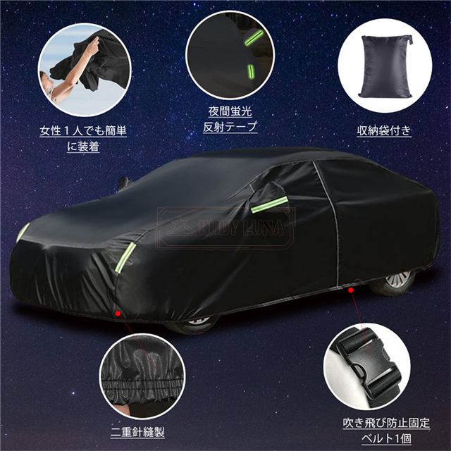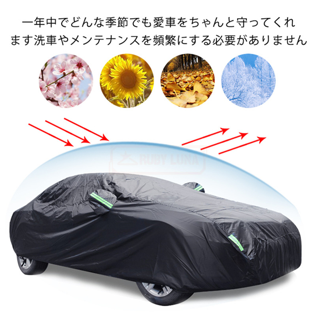 | 特徴 | ◆蛍光反射ライン付き、夜間でも愛車を簡単に見つけることができるだけではなく、安全性も増えます。 ◆強風対策、強風や台風の天気を解決するため、風が強いのでカバーが吹きやすいという問題を解決するために、しっかりとした防風コードを採用し、縫製部分を補強し、車の下に通して固定しました。 ◆凍結防止&積雪対策、雪が降る冬は毎日早起きして1時間、除雪に悩んでいますか。車カーディガンを買うと、この悩みが解消されます、優れた保温性で凍結を防ぎ、何度も凍った霜を取り除く作業から解放されます。 ◆ご愛車を守る駐車時の雨、鳥の糞、霧、ホコリ、大気中のガス等から 愛車のボディーをしっかりガードします! 梅雨の時期の湿気や、酸性雨等の車体を劣化させるのを防ぐ また直射日光による紫外線により塗装変色や太陽光による ダッシュボードの変形等を防いでくれます。 ◆簡単装着、簡単に自分でカバーできます。女性一人も2分で簡単にインストールできます。 ※ご注意ください、カバーは防水ですが、完全防水ではなく、大雨の中に長時間さらされている台風や大雨の中、縫製部分から雨水が入る恐れがあります。 |