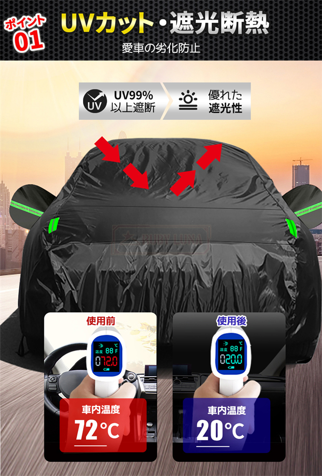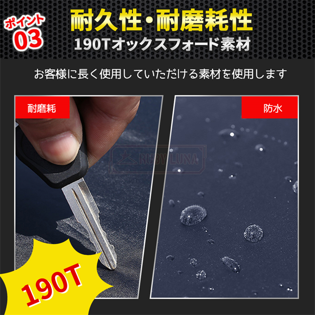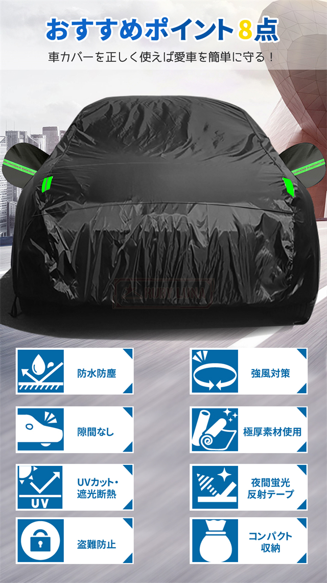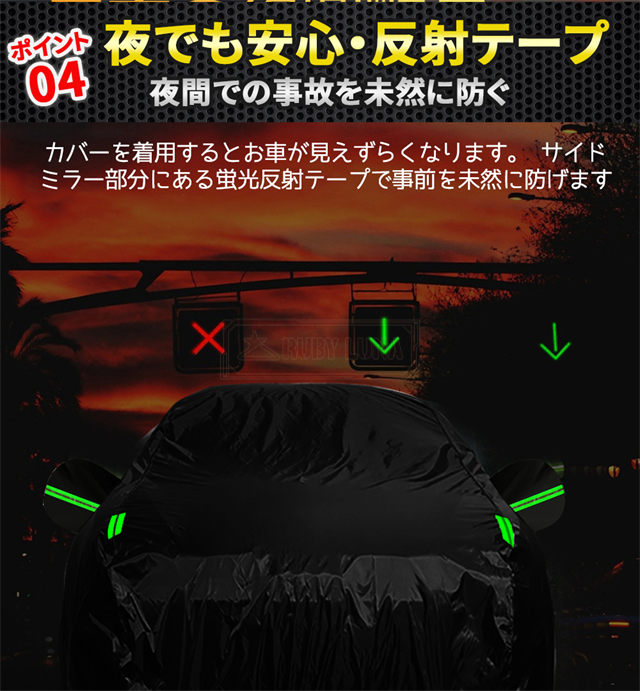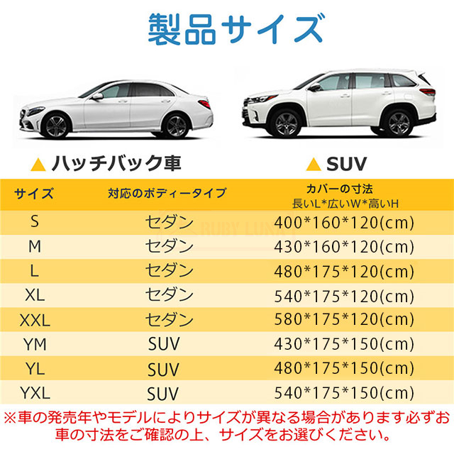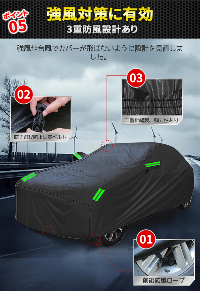 | 特徴 | ◆蛍光反射ライン付き、夜間でも愛車を簡単に見つけることができるだけではなく、安全性も増えます。 ◆強風対策、強風や台風の天気を解決するため、風が強いのでカバーが吹きやすいという問題を解決するために、しっかりとした防風コードを採用し、縫製部分を補強し、車の下に通して固定しました。 ◆凍結防止&積雪対策、雪が降る冬は毎日早起きして1時間、除雪に悩んでいますか。車カーディガンを買うと、この悩みが解消されます、優れた保温性で凍結を防ぎ、何度も凍った霜を取り除く作業から解放されます。 ◆ご愛車を守る駐車時の雨、鳥の糞、霧、ホコリ、大気中のガス等から 愛車のボディーをしっかりガードします! 梅雨の時期の湿気や、酸性雨等の車体を劣化させるのを防ぐ また直射日光による紫外線により塗装変色や太陽光による ダッシュボードの変形等を防いでくれます。 ◆簡単装着、簡単に自分でカバーできます。女性一人も2分で簡単にインストールできます。 ※ご注意ください、カバーは防水ですが、完全防水ではなく、大雨の中に長時間さらされている台風や大雨の中、縫製部分から雨水が入る恐れがあります。 |