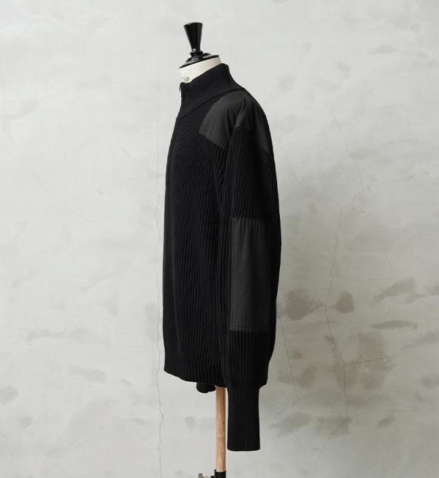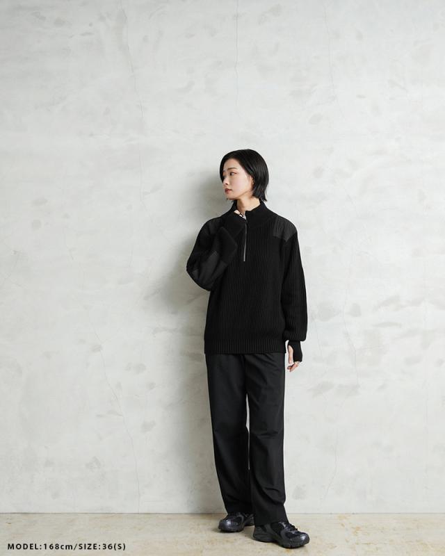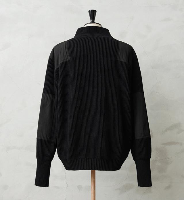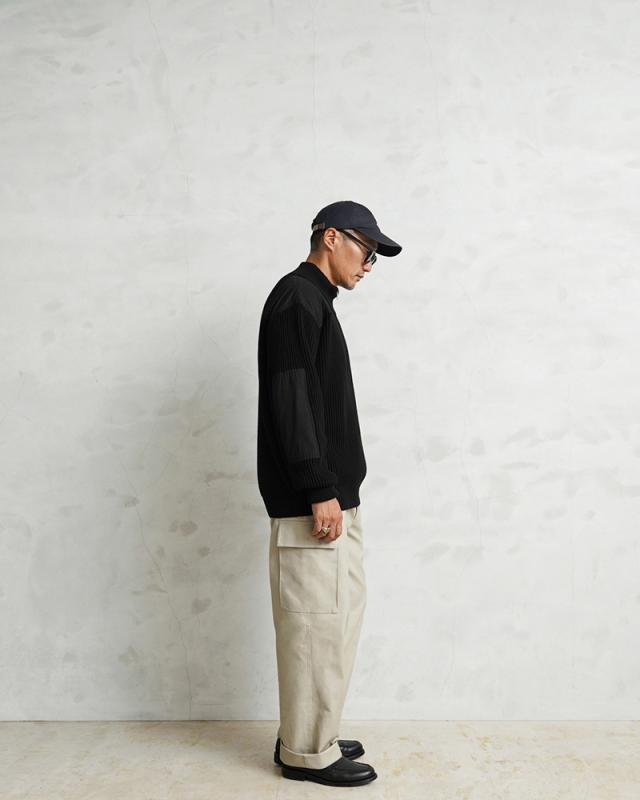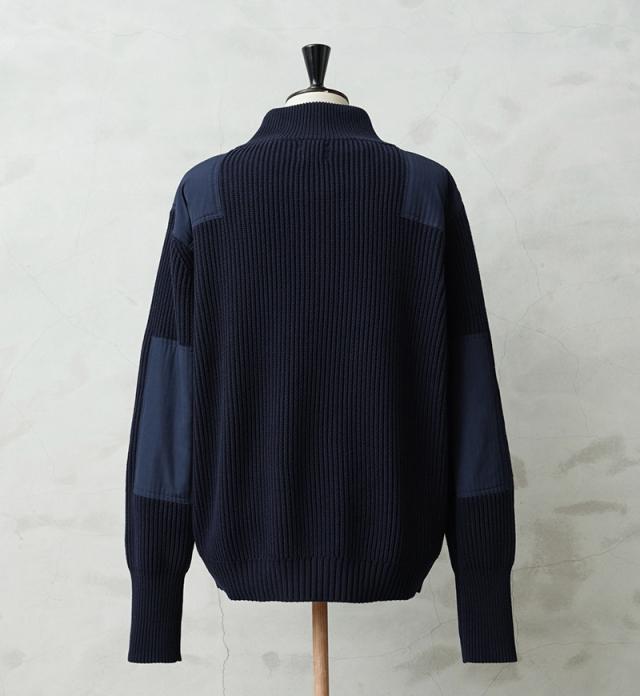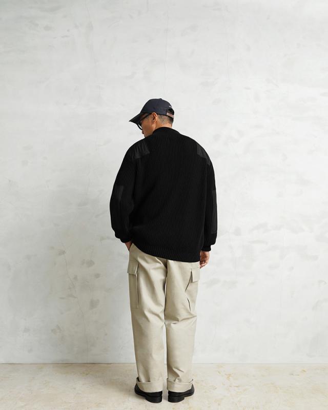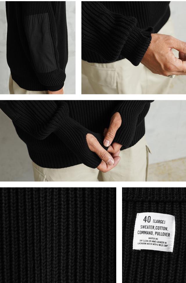 コマンドセーターを象徴する肩や肘部分のあて布は健在。袖口にサムホールを作ることで袖先で遊べるディテールを加えています。