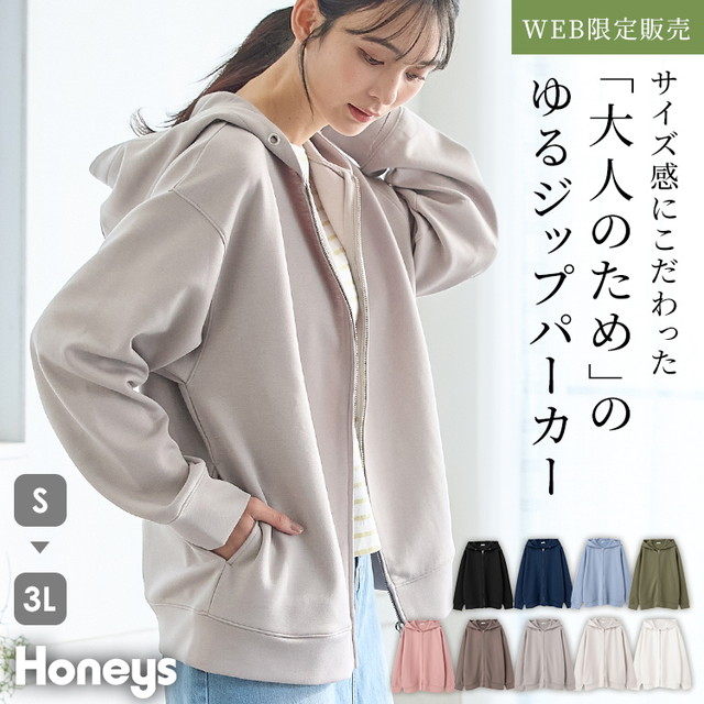 【WEB限定】トップス スウェット 長袖 大きいサイズ パーカー ジップパーカー レディース Honeys ハニーズ 大人のゆるジップパーカー