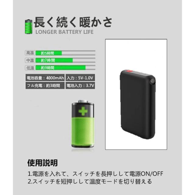 【3.7V 4000mAh充電式リチウムバッテリー】加熱ソックスは二本の充電式リチウムバッテリーを内蔵されて、充電時間が約3~4時間です。加熱ソックスは最低の設定で約9時間、中程度の設定で約6時間、最高の設定で約3時間持続します。暖かさ長持ち、長時間の移動時や、デスクワークなどに最適です。そして、手洗いにも洗濯機にもOK、長くお使い頂けます。