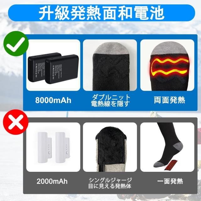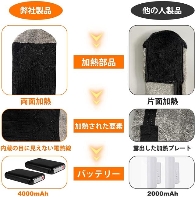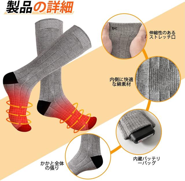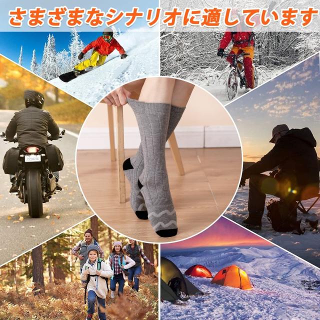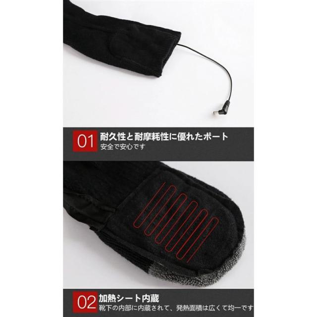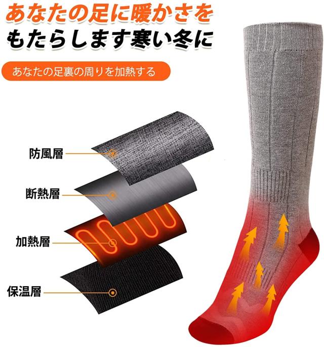 【着心地いい超高品質電熱靴下】この加熱ソックスは82%綿、8%ポリエステ10%弾性素材を採用しており、優れた防寒保温性能を実現しながら、吸収性、通気性、速乾性、伸縮性を備えます。耐久性が抜群、履き心地が快適な加熱靴下です。足先の寒さ対策とした靴下は靴下の底部にヒーターを内蔵したことで底冷えから足を温めることで、全身の冷え予防になります。加熱機能を使用しない場合は、普通の靴下としても適合します。