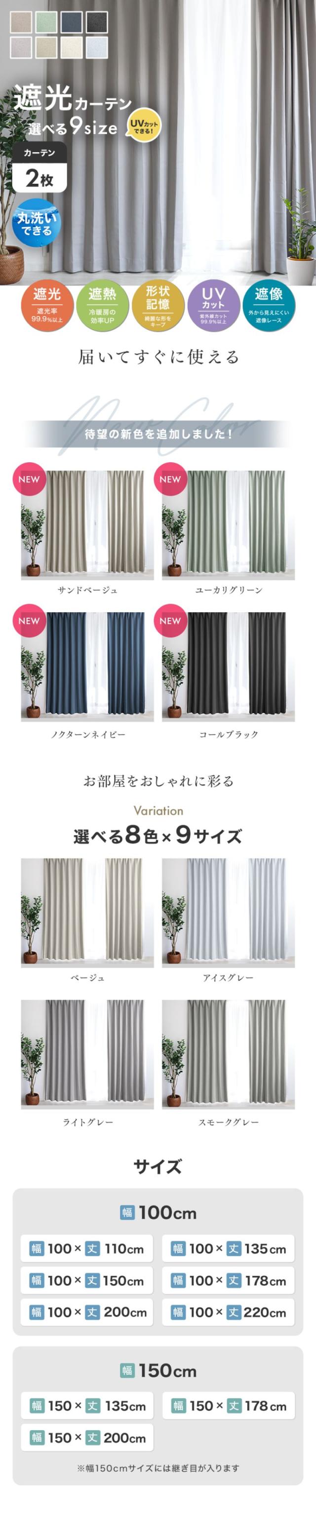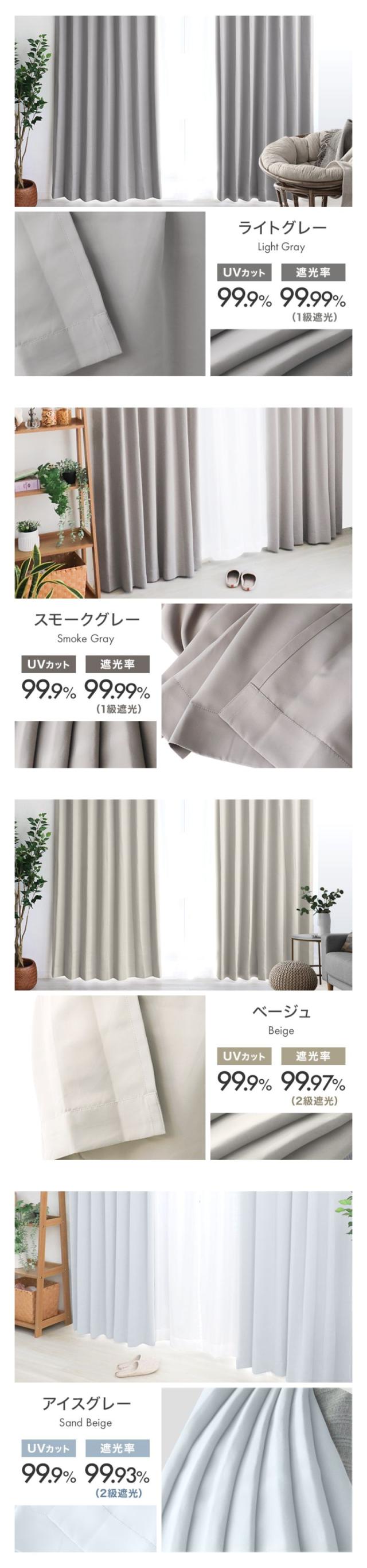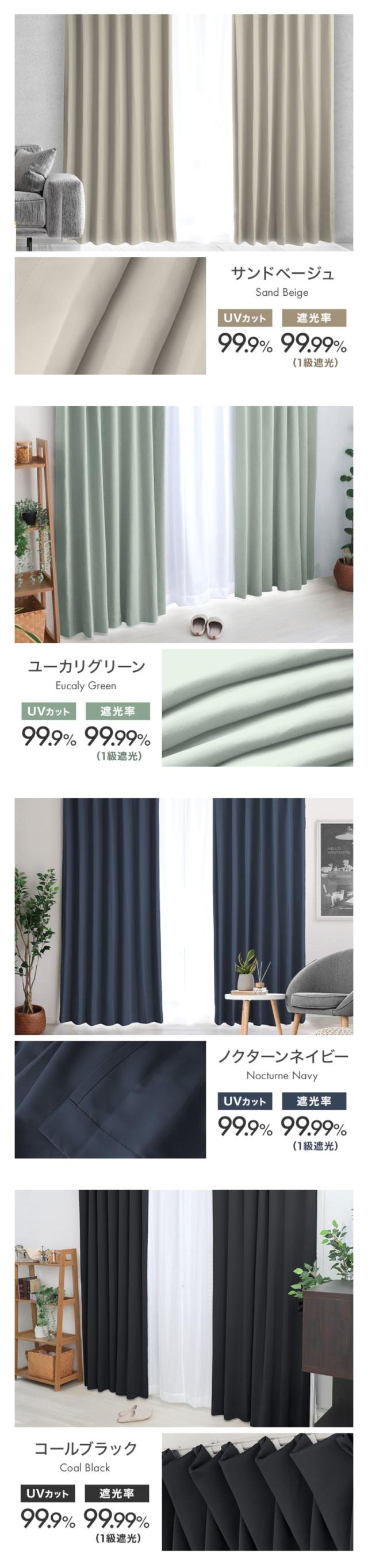 スモークグレー(1級遮光) ベージュ(2級遮光) アイスグレー(2級遮光) サンドベージュ(1級遮光)≪NEW≫ ユーカリグリーン(1級遮光)≪NEW≫ ノクターンネイビー(1級遮光)≪NEW≫ コールブラック(1級遮光)≪NEW≫ |