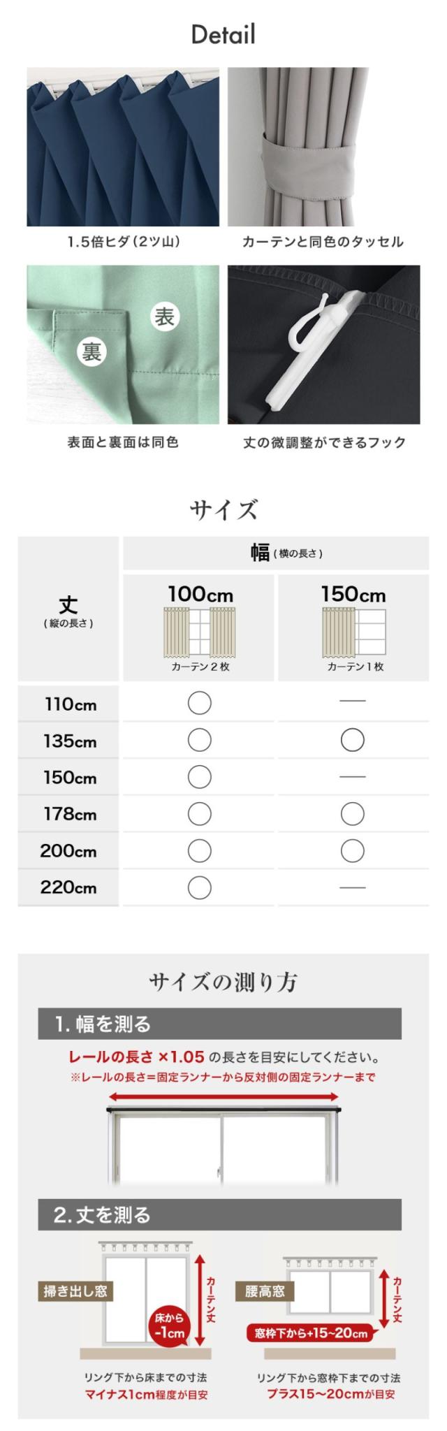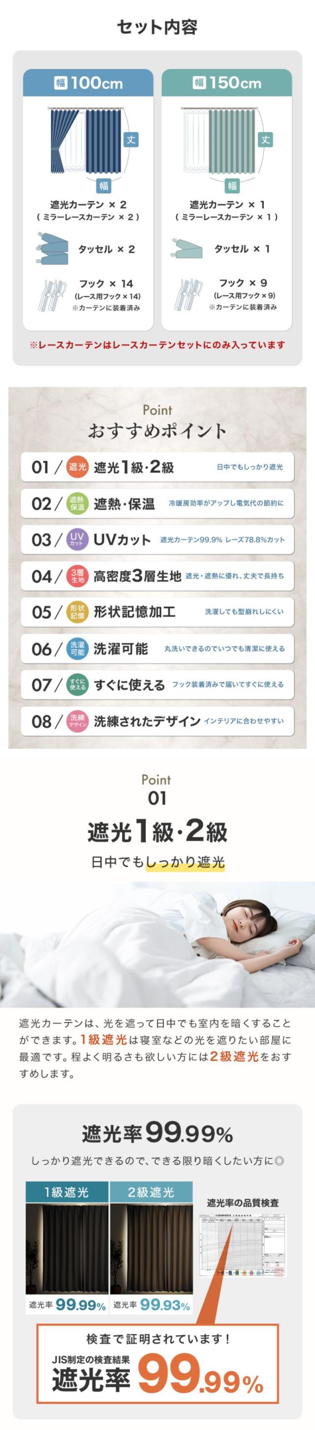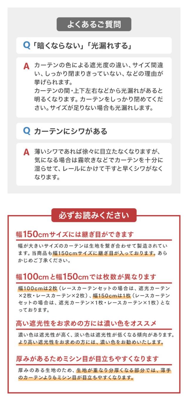 | 内容 | 【幅100cm】 遮光カーテン 2枚 タッセル 2枚 カーテンフック 14個 【幅150cm】 遮光カーテン 1枚 タッセル 1枚 カーテンフック 9個 |