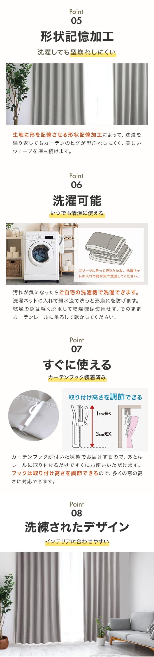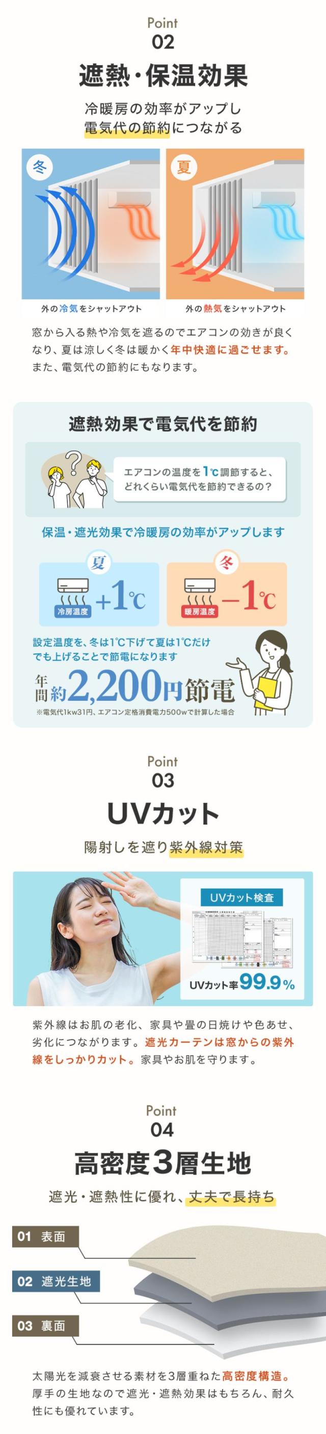 | 特徴 | ・1・2級遮光 ・UVカット ・遮熱・保温 ・高密度・三層厚地 ・形状記憶 ・洗濯可能 |