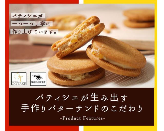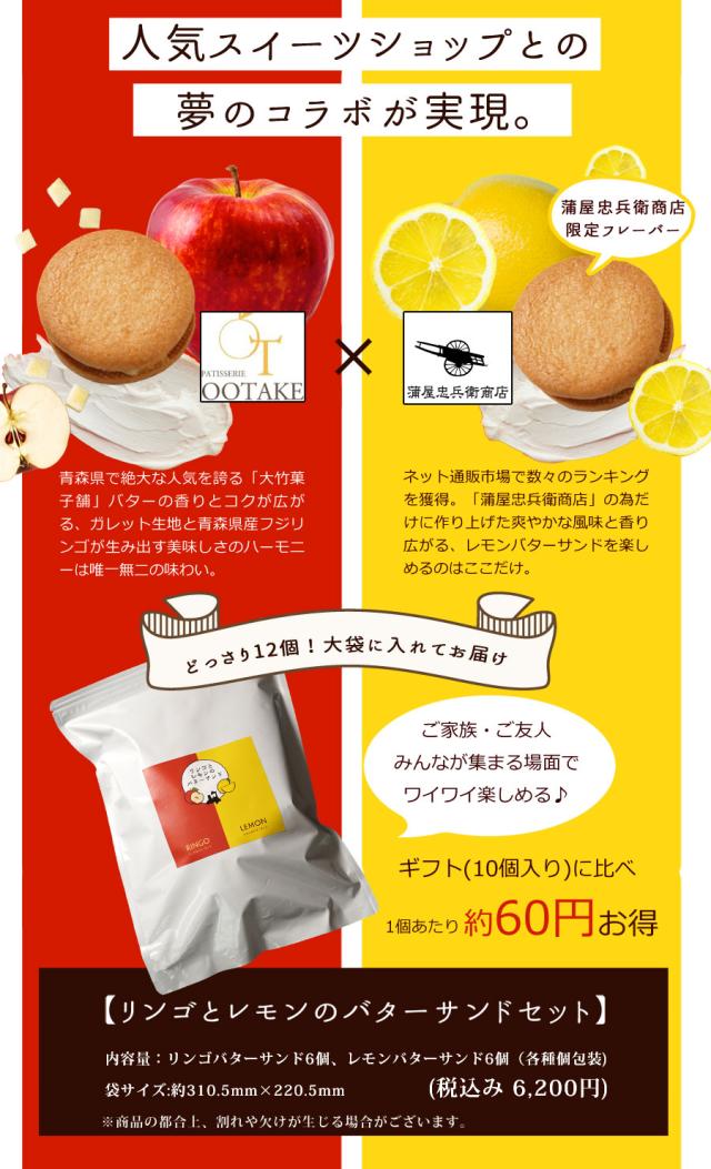 | 青森県で長年愛され続けるパティスリー大竹菓子舗が生み出珠玉のガレットバターサンドが誕生! サクサク食べ応え抜群のガレットクッキー生地に青森県産フジリンゴの蜜漬けをバタークリームにたっぷり挟んだリンゴのバターサンドと、ヨーロッパ産レモンの爽やかな香りを引き立てつつ当店だけでしか味わえないレモンのバターサンドをセットにしました。 |