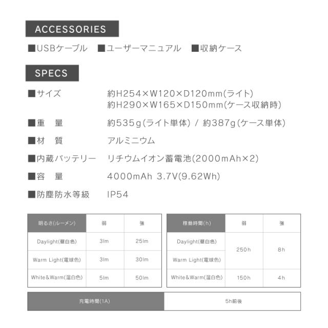 | 仕様 | ■セット内容:本体・収納ケース・USBケーブル・取扱説明書兼保証書 ■動作環境:0〜40℃ ■バッテリー:リチウムイオン蓄電池(2000mAh×2) ■容量:4000mAh 3.7V(9.62Wh) ■入力:DC5V 1A ■防塵防水等級:IP54 ■LEDライト:昼白色 MAX13.5W(6000K〜6500K) 温白色 MAX13.5W(3000K〜3500K) 電球色 MAX27W(3600K〜4500K) ■明るさ(全光束):3〜50lm ■点灯時間:最大250時間 ■充電時間(1A):5時間前後 ■メーカー保証:購入日より6ヶ月 |