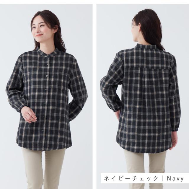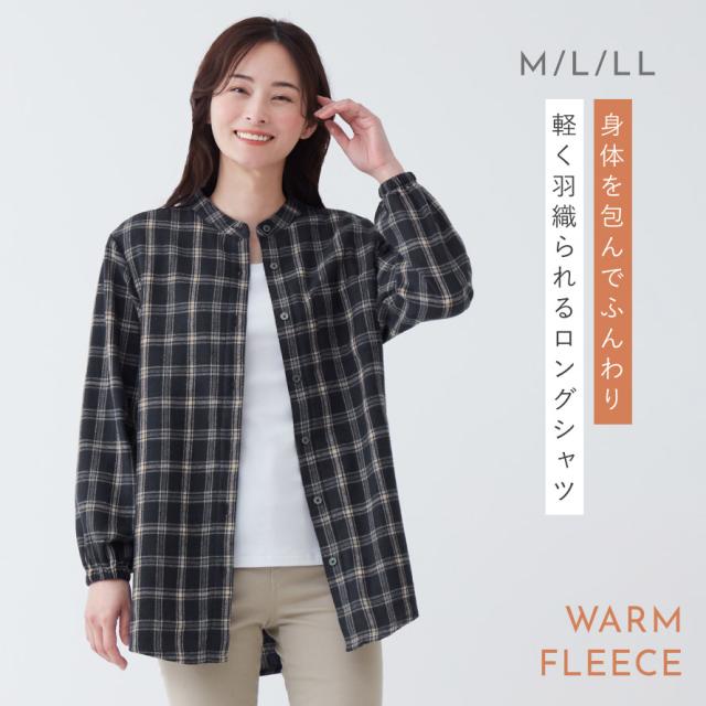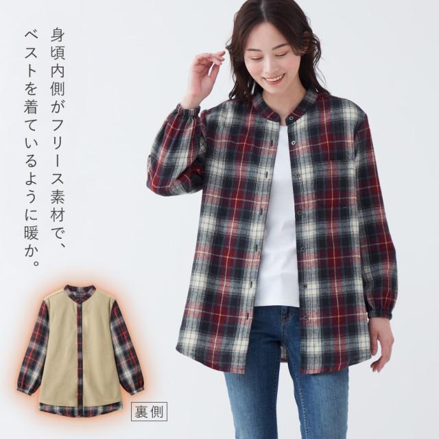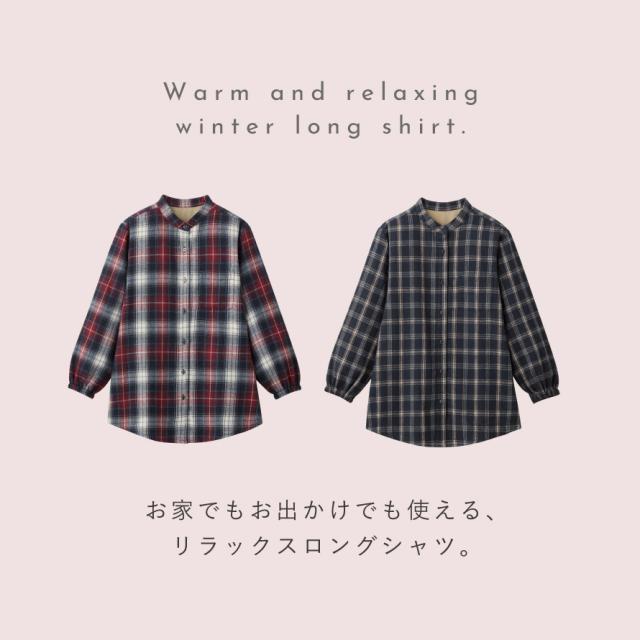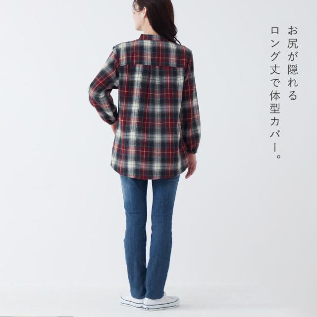 チェックシャツ レディース 冬 フリース シャツ チェック スタンドカラー チュニック 体型カバー 暖かい あったか チェック柄 あったか裏フリースロングシャツ シニアファッション 50代 60代 70代 ミセスファッション シンプル