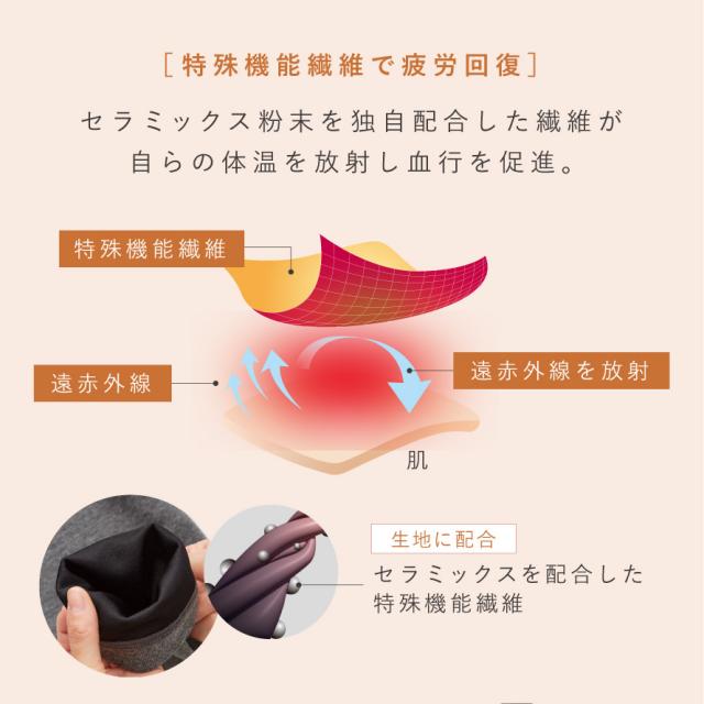 遠赤外線効果のあるセラミックス粉末を配合した特殊繊維が、体温を輻射し血流を促進。