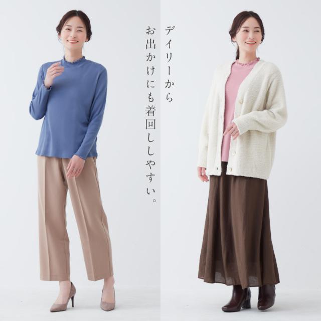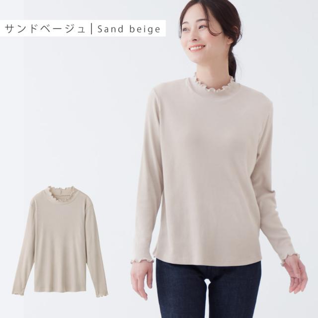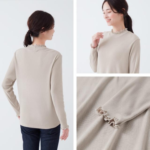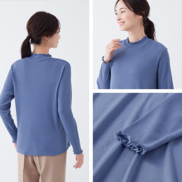 首回りがゆったりとした低めのハイネック。苦しくなく、気になる首回りをカバーします。