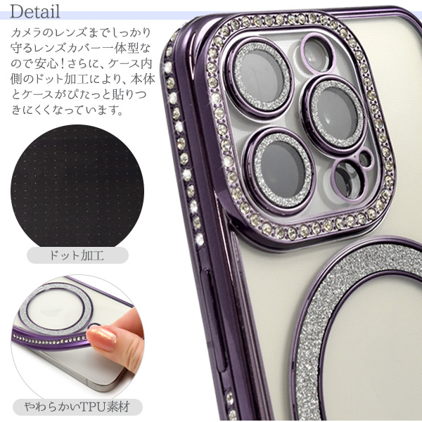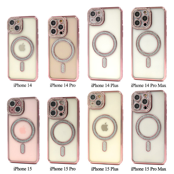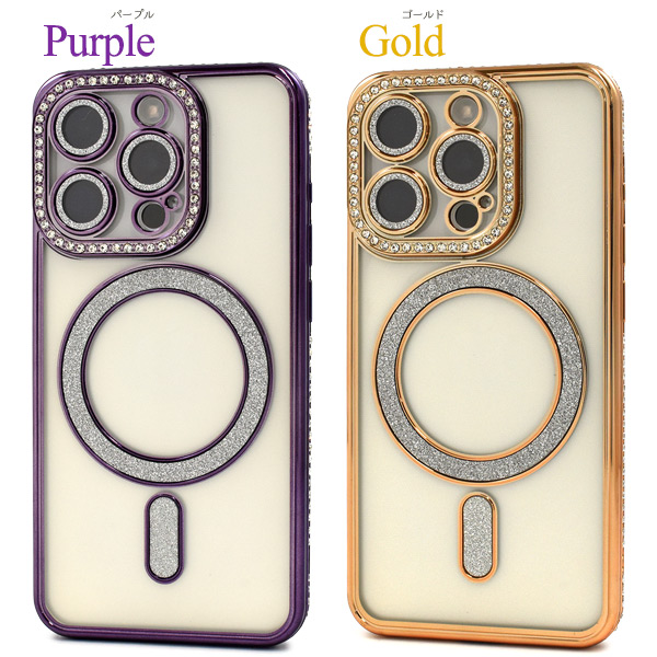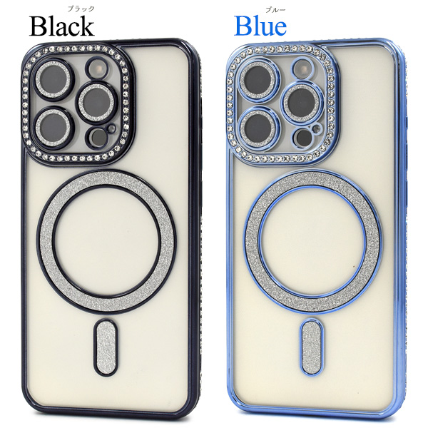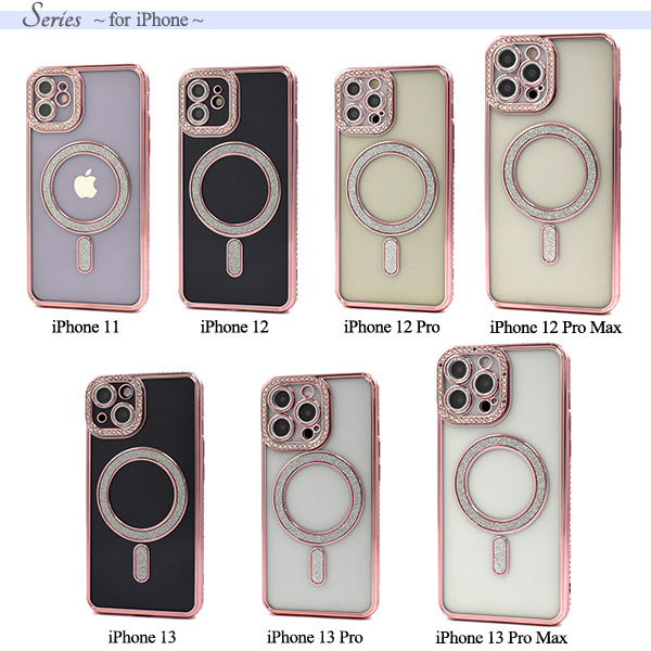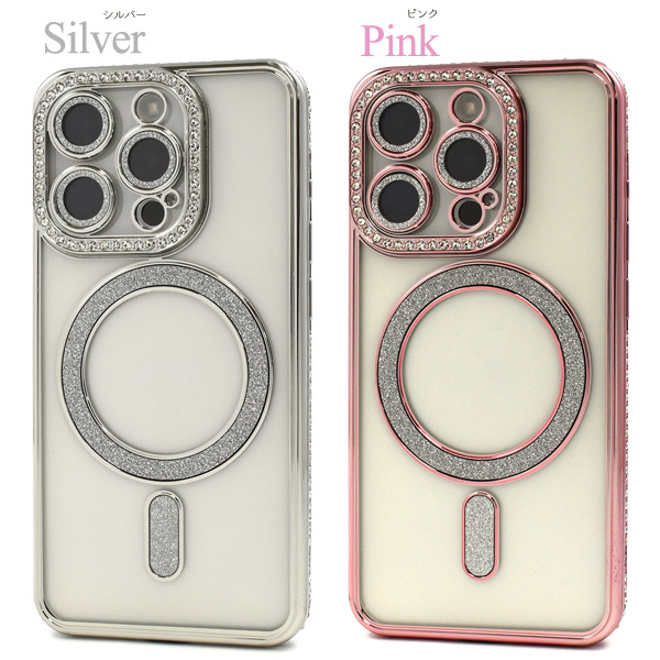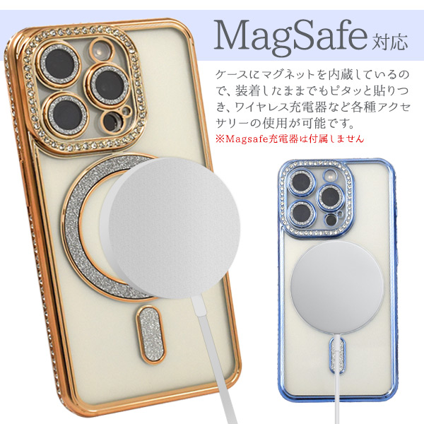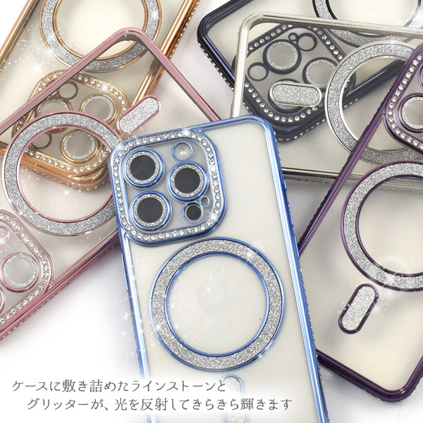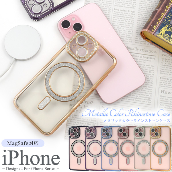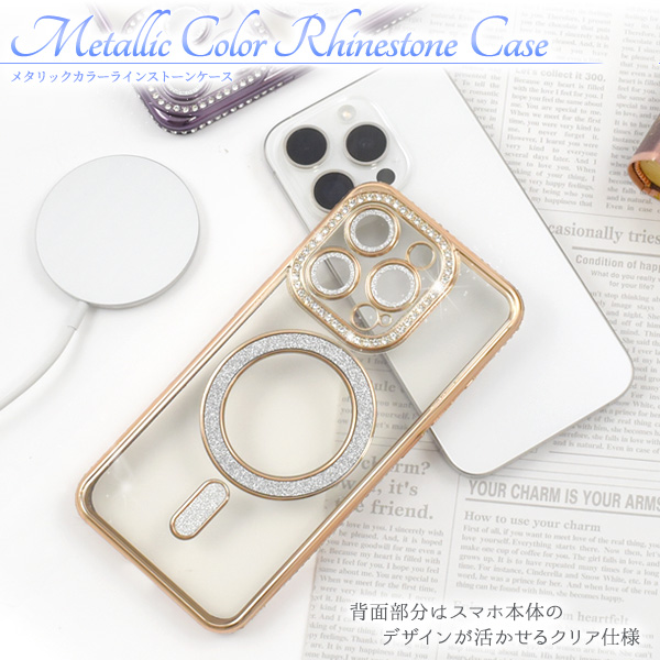 スマホケース iPhone11〜15用 MagSafe対応 メタリックカラー ラインストーンケース クリアケース アイフォン マグセーフ対応 キラキラ デコレーション 背面 保護 カバー 透明 スマホカバー ワイヤレス充電 iPhoneシリーズ