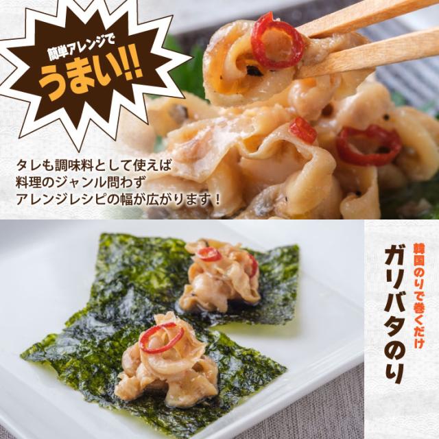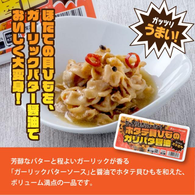 【原材料名】ほたてひも(宮城県産)、ガーリックバターソース(食用植物油脂、油脂加工品(食用植物油脂、バター)、岩塩、砂糖、香味料)、しょうゆ、こしょう、唐辛子/増粘剤(加工でんぷん、増粘多糖類)、調味料(アミノ酸等)、酸味料、香料、乳化剤、クチナシ色素、(一部に乳成分・大豆・小麦を含む)