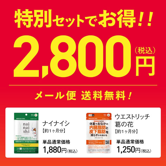 | 内容量 | ナイナイシ:21.7g(350mg×62粒)約1か月分 ウエストリッチ 葛の花:15.0g(250mg×60粒) 30日分 |