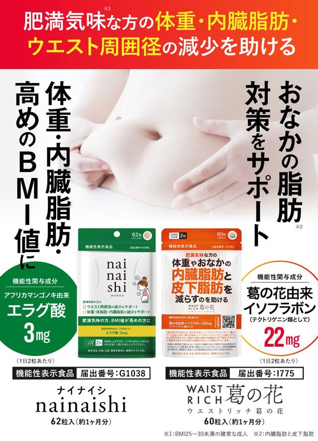 | 届出表示 | ▼ナイナイシ 本品にはエラグ酸が含まれています。エラグ酸は肥満気味の方の体重、体脂肪、血中中性脂肪、内臓脂肪、ウエスト周囲径の減少をサポートし、高めのBMI値の改善に役立つことが報告されています。肥満気味の方、BMI値が高めの方に適した商品です。 ▼ウエストリッチ葛の花 本品には、葛の花由来イソフラボン(テクトリゲニン類として)が含まれます。 葛の花由来イソフラボン(テクトリゲニン類として)には、肥満気味な方の、体重やお腹の脂肪(内臓脂肪と皮下脂肪)やウエスト周囲径を減らすのを助ける機能があることが報告されています。 |