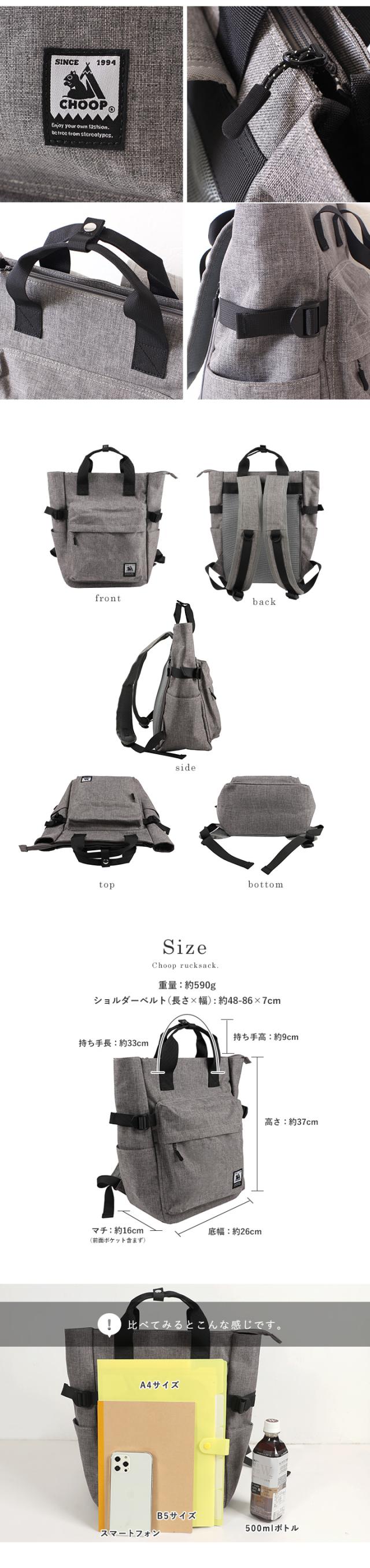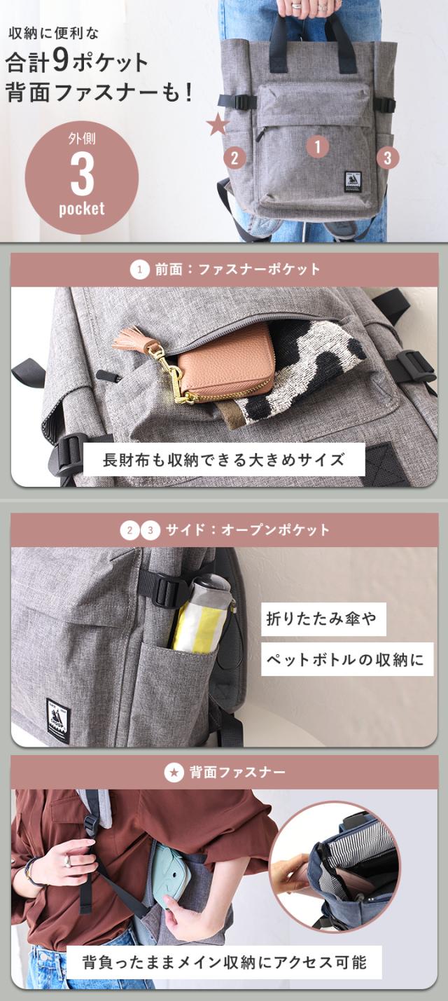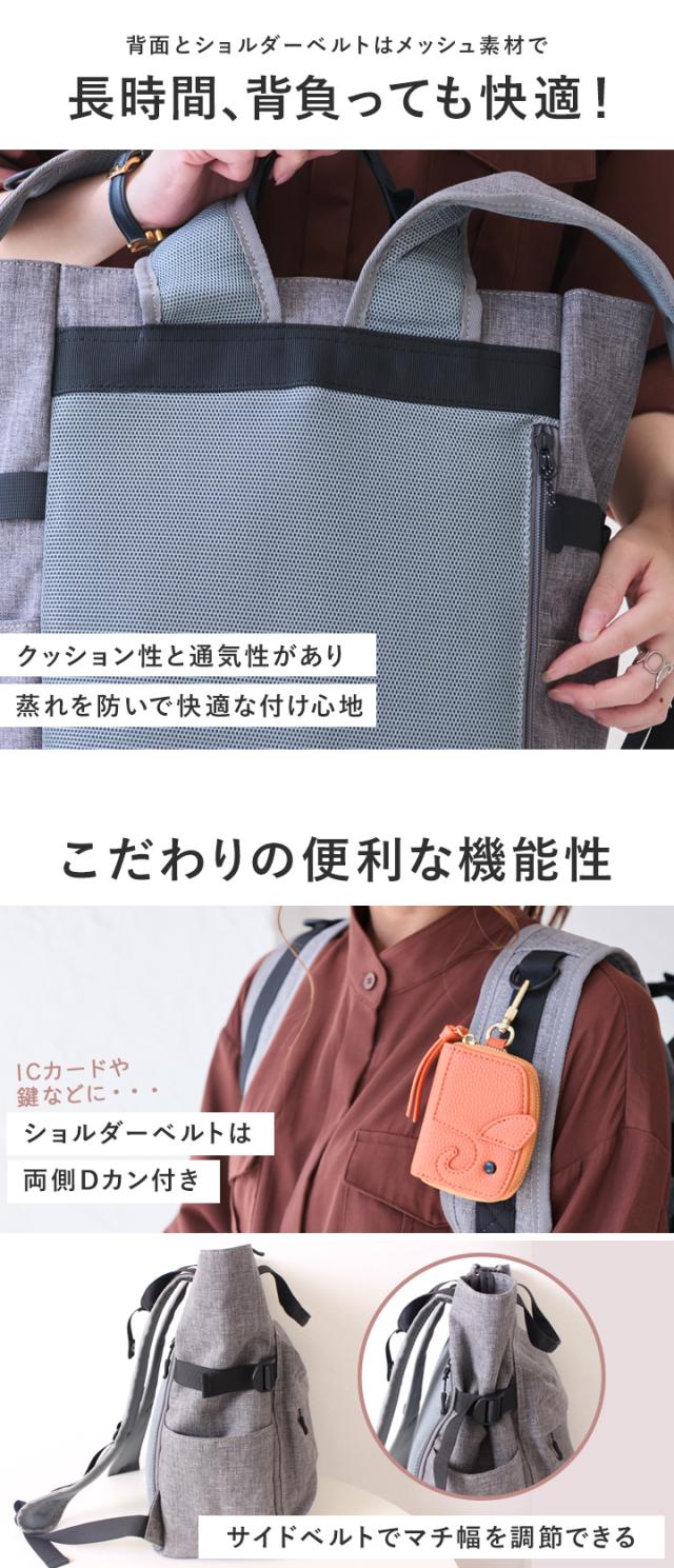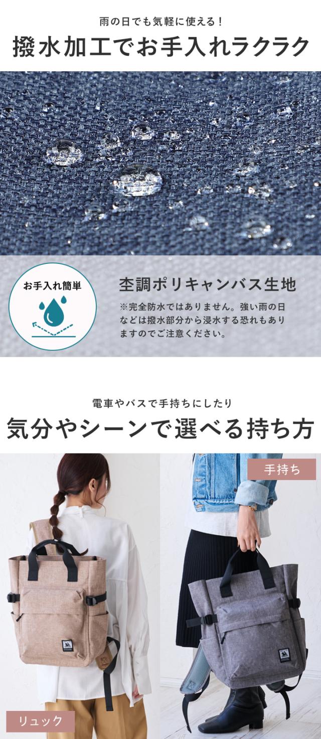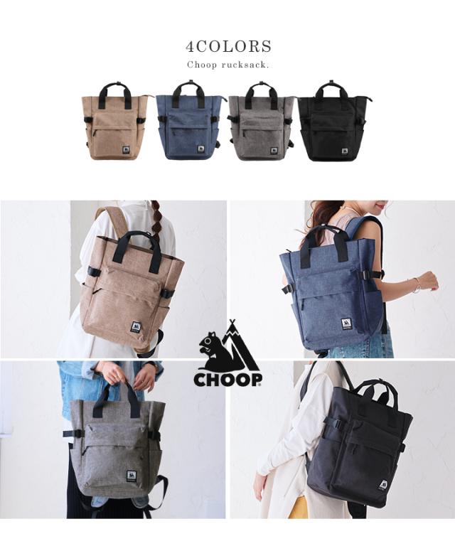 リュックも手持ちも! 充実したポケット数と機能性 CHOOP「Sortir」シリーズ 持ち手付きなので、電車やバスで手持ちしたり 気分やシーンに合わせて持ち方を選べます◎ 四角形に開く開口部は荷物を入れやすく 荷物の量に対してリュックの容量を調節できるサイドベルト付き。 通勤・通学・旅行など幅広いシーンで大活躍! ママバッグとしても◎ 合計9個のポケットで小物類もしっかり収納できます。 背負ったままメイン収納にアクセスできる背面ファスナーも! 撥水加工を施した杢調のポリキャンバス生地で 雨の日も気軽に使えて、お手入れラクラク! 背面とショルダーにクッション性と通気性があるメッシュ素材を 使用していて長時間、背負っていても蒸れずに快適。 |
