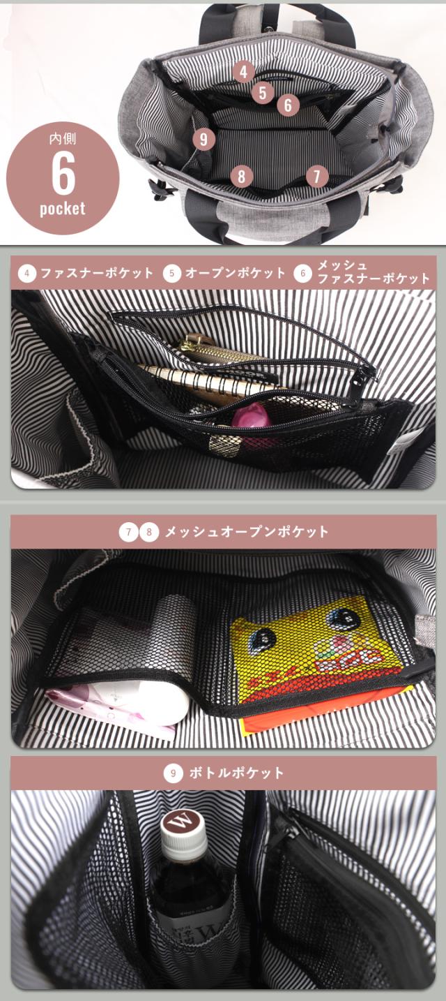 内側:ファスナーポケット×1、メッシュファスナーポケット×1、オープンポケット×1、メッシュオープンポケット×2、ボトルポケット×1