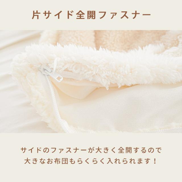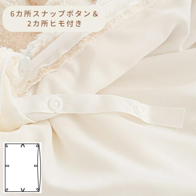 ・かわいいデザイン 世界中で愛される物語「ピーターラビット」がかわいいカバーになりました。子どもから大人まで使える落ち着いたデザインです。 ・裏面あったかシープボア素材羊のようなもこもことした風合いのシープボア。ずっと触れていたくなるようなふわふわ感が気持ちいい。 ・表面シルエットデザインピーターラビットとお花や植物は散りばめられたシルエットデザイン!毛足の長さで柄を表現した立体感のあるジャガード織りでかわいい仕上りです ・裏貼りありタイプカバーの内側に布を縫いこんだ裏貼りありタイプ。内側に毛玉ができにくくなっています。 サイドのファスナーが大きく全開するので大きなお布団もらくらく入れられます! ・6ヶ所スナップボタン付き布団とズレないように留めるヒモがスナップボタンタイプ!ぱちんとボタンを留めるだけなのでセットが簡単になりました。 ・洗濯機で洗えるご家庭の洗濯機で丸洗いできます。汚れてきたら気軽にお洗濯できるのでいつだって清潔に保てます。 |