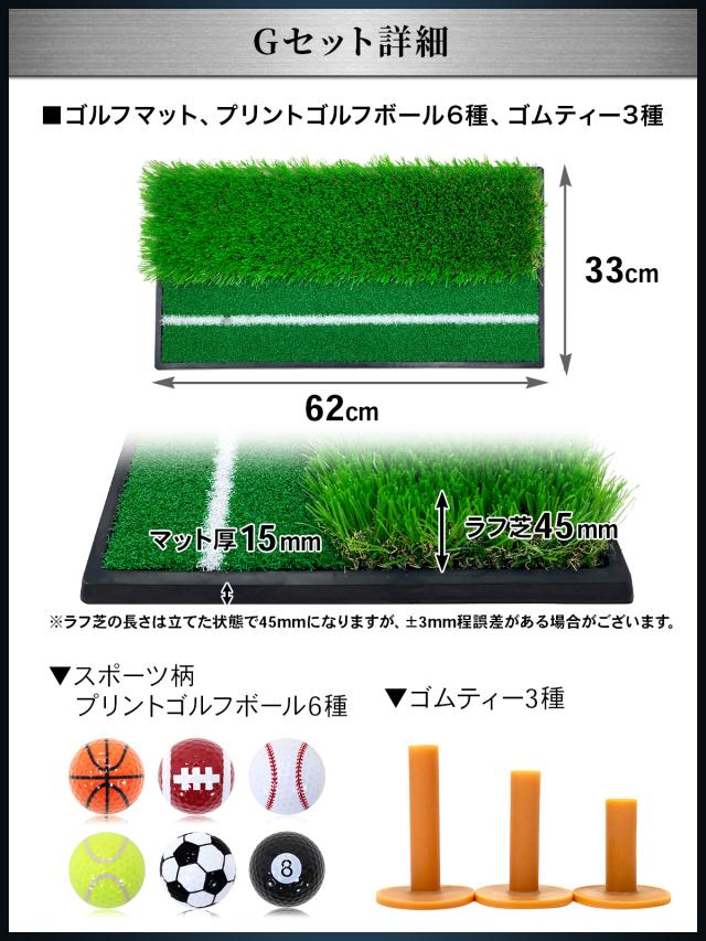 ゴルフマット ゴルフ 練習 マット 33×62cm Gセット 2WAY 人工芝 ラフ 45mm フェアウェイ ゴムマット土台が重いから動かない 素振り 軌道確認 ドライバー アイアン スイング 練習用 深ラフ芝 ゴルフティー ゴルフボール
