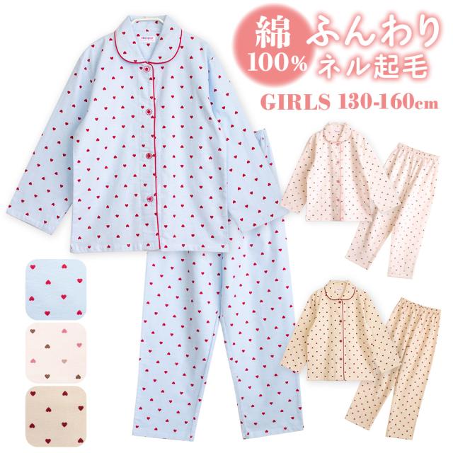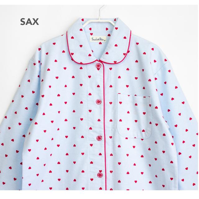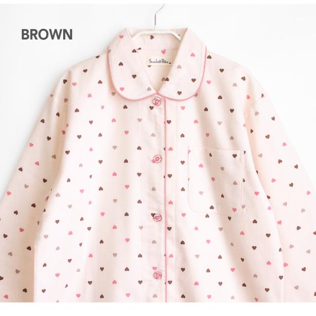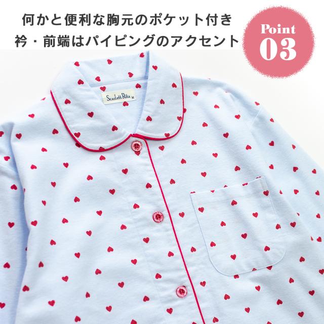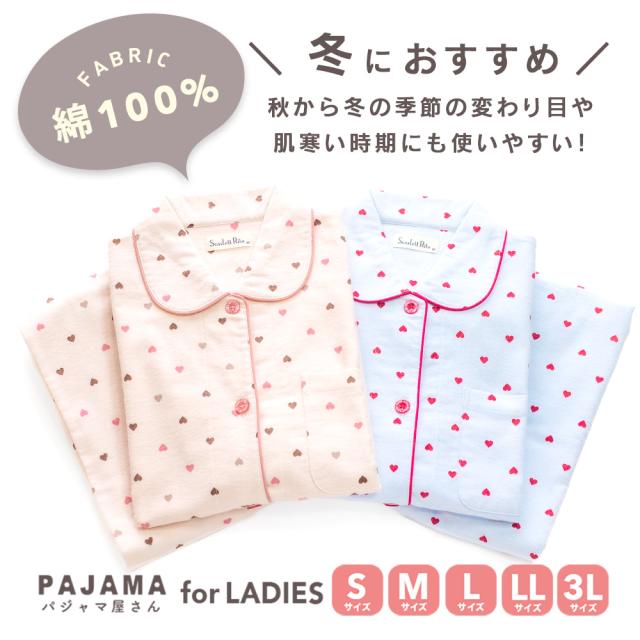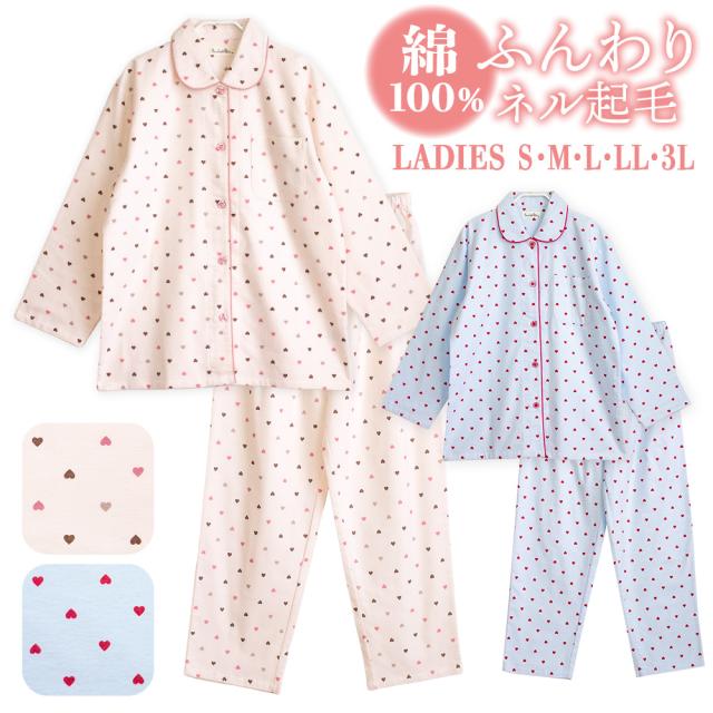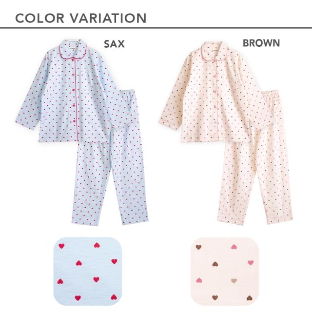 パジャマ レディース 綿100% 長袖 冬 前開き ボタン ネル起毛 前開き ハートドット柄 サックス ブラウン S M L LL 3L かわいい 親子 おそろい リンクコーデ 家族 ギフト プレゼント 敬老の日 母の日 60170