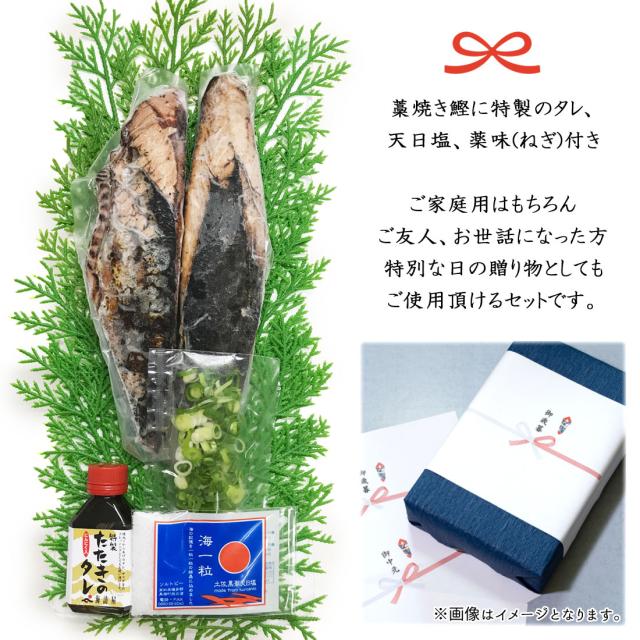 特製タレとネギ、高知県産の天日塩がセットになっており、
