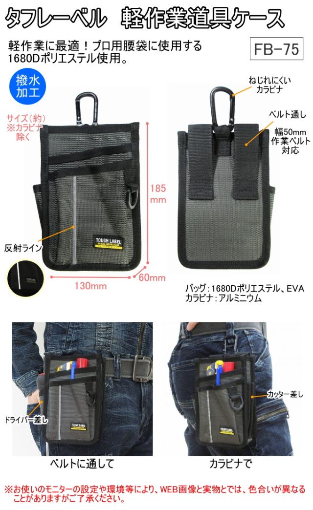 タフレーベル 軽作業道具ケース FB-75 バッグ バック ポーチ 携帯小物入れ 腰袋 作業ポーチ 工具差し 作業道具入れ 小物入れ 収納 1680Dポリエステル使用 撥水加工 反射ライン付 カラビナ付 ベルト通し 50mm幅 カーキ 中林製作所 冒険倶楽部