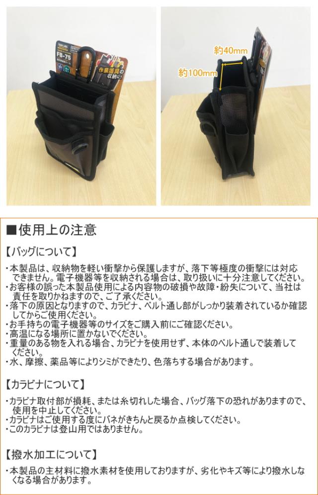 プロ用腰袋に使用する1680Dポリエステル使用。一味違う高級感ある生地。 作業道具の携帯収納に。 ねじれにくいカラビナ、ベルト通しも付いているので、好みやシーンに合わせて装着が可能です。 幅50mmの作業ベルト対応。 左側にドライバー、右側にカッターを収納できます。 ※ご使用のパソコンの設定や環境などにより、画像と実物の色合い等が異なる場合がございますがご了承ください。 ■そのほかの小物入れはこちら↓ 携帯小物ケース一覧 |