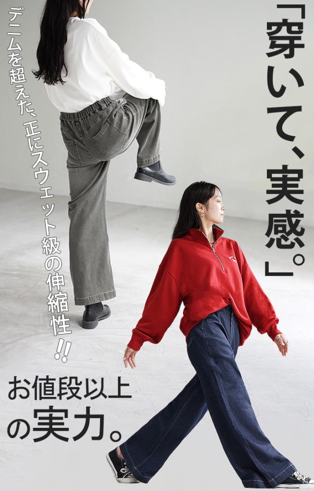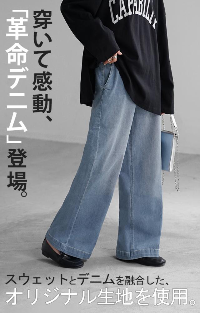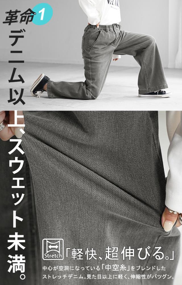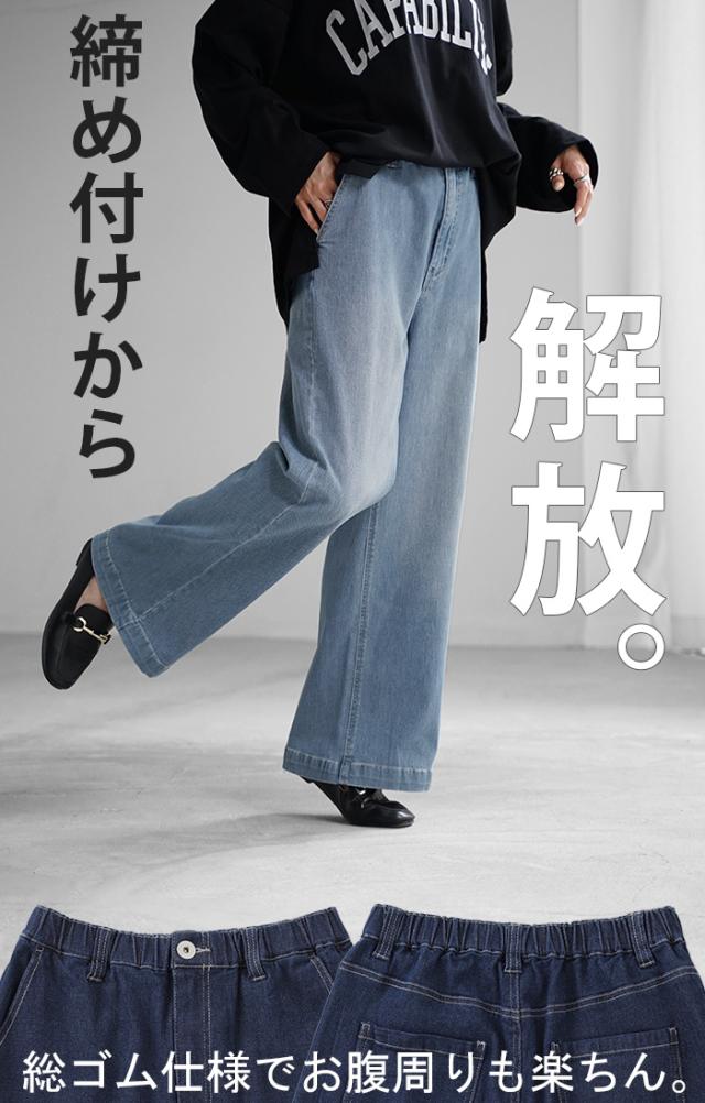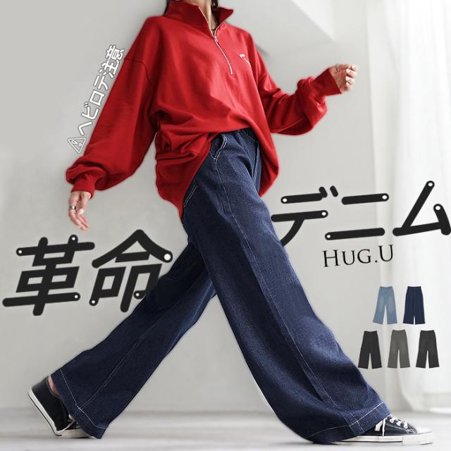パンツ デニム スウェット ストレッチ レディース ボトムス ボトム ジーンズ ジーパン 無地 ハイライズ バギー ワイド ストレート ウエストゴム 軽い 軽量 ずぼん ズボン ワイドパンツ カジュアル 体型カバー 大きいサイズ ネイビー 黒 秋 冬 HUG.U 秋新作