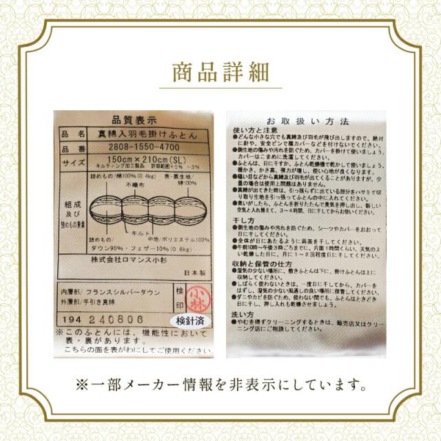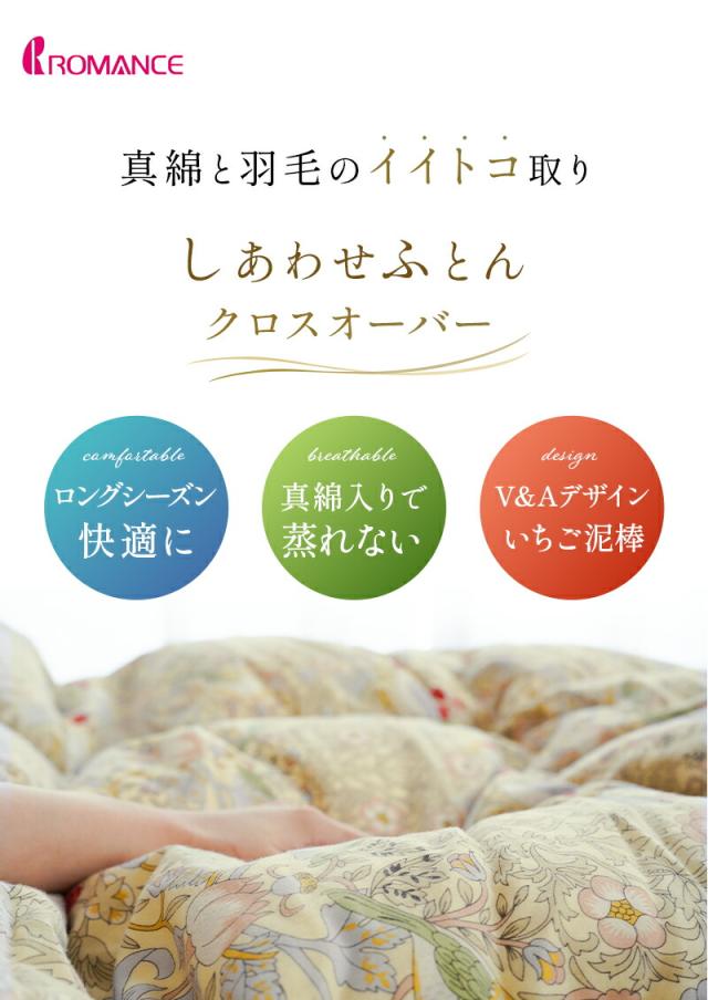 [ keyword | ロマンス小杉 真綿(シルク)入り羽毛掛け布団 しあわせふとん クロスオーバー フランス ダウン 90% シングル 日本製 国産 羽毛 150×210cm シングルロング 高気密住宅 完全立体キルト 特殊キルト 年中 オールシーズン ]