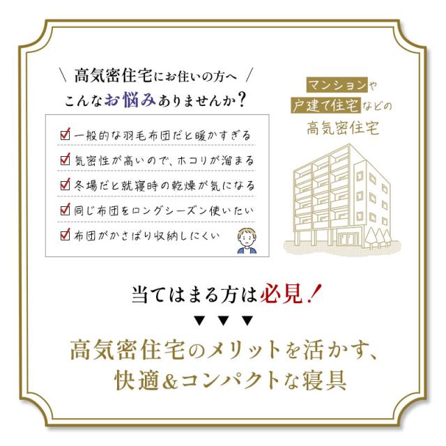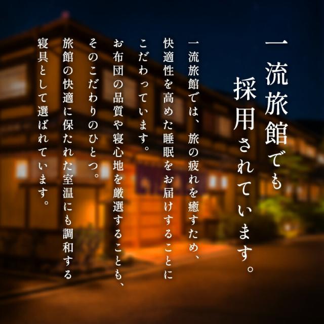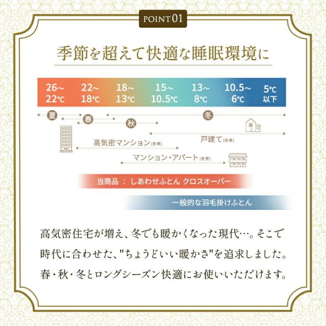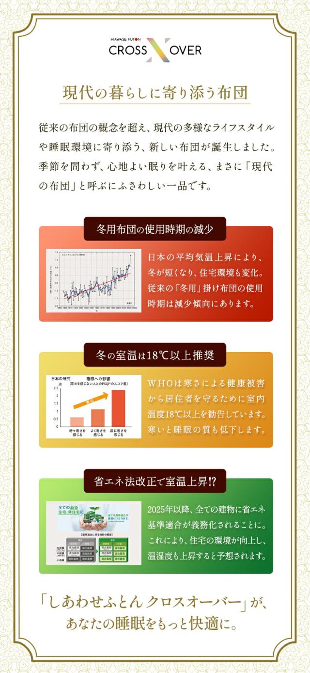| ・季節を超えて快適な睡眠環境に 高気密住宅が増え、冬でも暖かくなった現代…。そこで時代に合わせた、"ちょうどいい暖かさ"を追求しました。春・秋・冬とロングシーズン快適にお使いいただけます。 ・暖かいのに蒸れにくい!真綿はやわらかな肌ざわりで、吸湿・発散性に優れ、汗などの余分な湿気を外へ逃がします。羽毛は抜群の保温性をもち、心地よい暖かさに包まれます。 ・フランス産シルバーダウン美食の国、フランス産のシルバーダウンを使用しました。たんぽぽの綿毛のようなふんわりとしたダウンをたっぷり90%配合したお布団は空気を含んで暖かいです。 ・完全立体&よりそい仕立て下層の真綿層は18カ所の菱形キルトで、縫製による真綿を抑える箇所が少なく、手引き真綿のよさであるふんわり感を出し、身体により沿いが良い仕立です。 ・スピンエアー使用生地クラボウ独自開発の中空糸「スピンエアー」を使用した、ふんわり軽く、肌ざわりなめらかな寝具です。優れた吸湿性で一年中快適にお使いいただけます。 ・一流旅館でも採用されています。一流旅館では、旅の疲れを癒すため、快適性を高めた睡眠をお届けすることにこだわっています。お布団の品質や寝心地を厳選することも、そのこだわりのひとつ。旅館の快適に保たれた室温にも調和する寝具として選ばれています。 ・現代の暮らしに寄り添う布団「SHIAWASE FUTON CROSSOVER しあわせふとんクロスオーバー」は従来の布団の概念を超え、現代の多様なライフスタイルや睡眠環境に寄り添う、新しい布団が誕生しました。季節を問わず、心地よい眠りを叶える、まさに「現代の布団」と呼ぶにふさわしい一品です。 | |