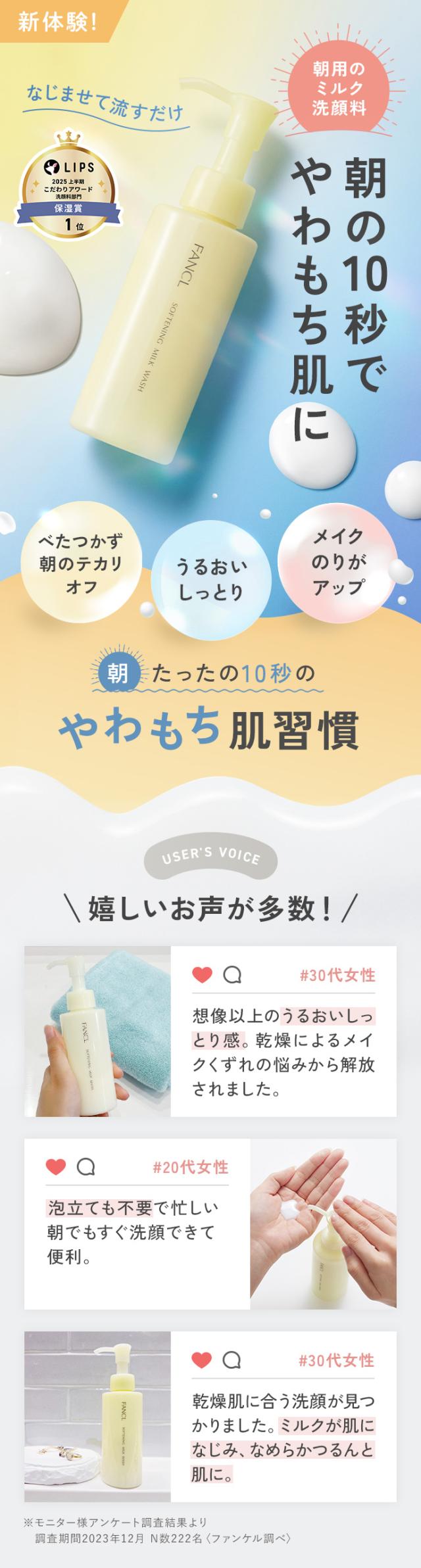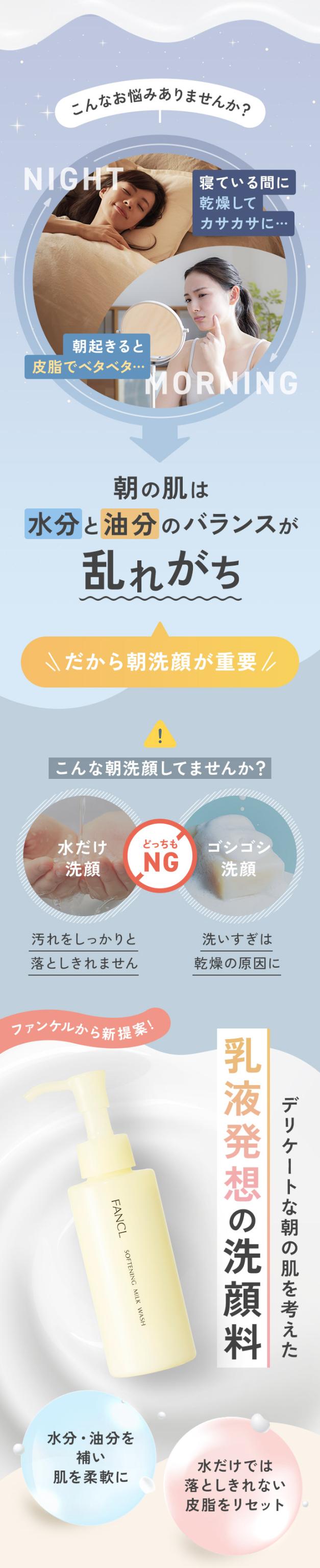 しっとりやわらか肌に洗い上げる朝用ミルク状洗顔料で、メイクのりもアップ。泡立て不要で、乾いた肌に直接ミルクをなじませサッとすすぐだけで洗顔完了。目覚めたての肌からテカリやべたつきの原因をオフし、うるおうふっくら肌に整えます。