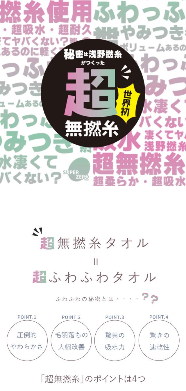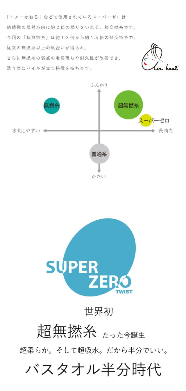 魔法の撚糸 スーパーZERO で作られたタオルです。たっぷりなボリュームがありながらも、部屋干しも可能な乾きの早さが特徴です。吸水力は一般的なタオルの5倍。そんな魔法のタオル、是非お試しください。